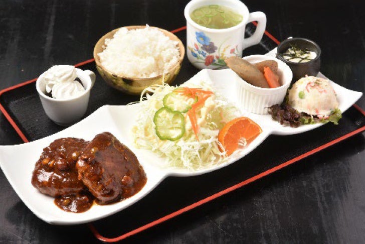 ハンバーグセット(ハンバーグ・ライス・スープ・キャベツ・ポテトサラダ・酢の物・煮物) 750円