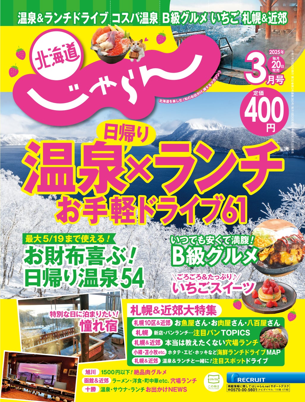 お手軽!日帰り温泉×ランチドライブ61、<コスパ抜群>日帰り温泉54湯、いつでも安くて満腹・満足♪絶品B級グルメ、ごろごろたっぷり♪いちごスイーツ、【札幌&近郊】本当は教えたくない穴場ランチ…など今月も旬の情報が満載です。ぜひご覧ください。