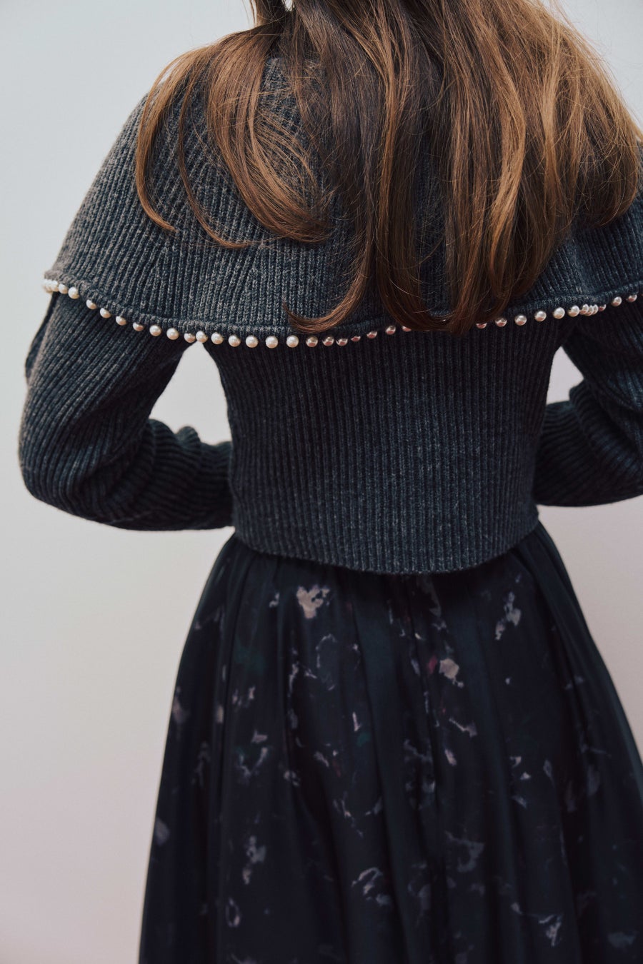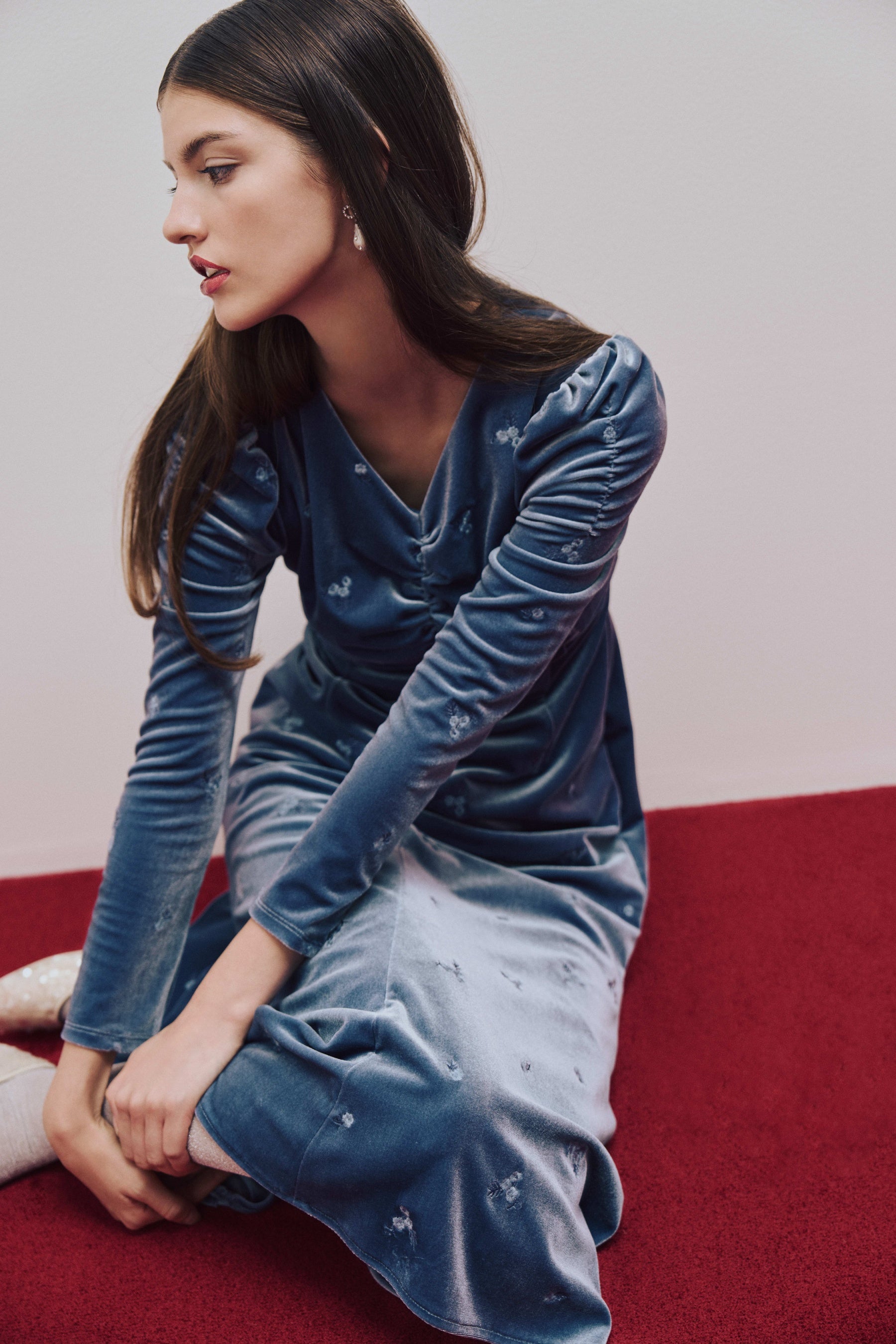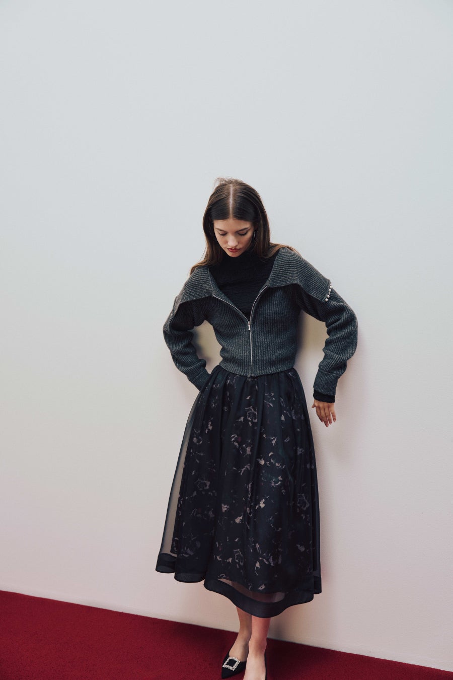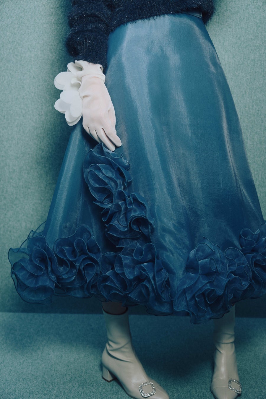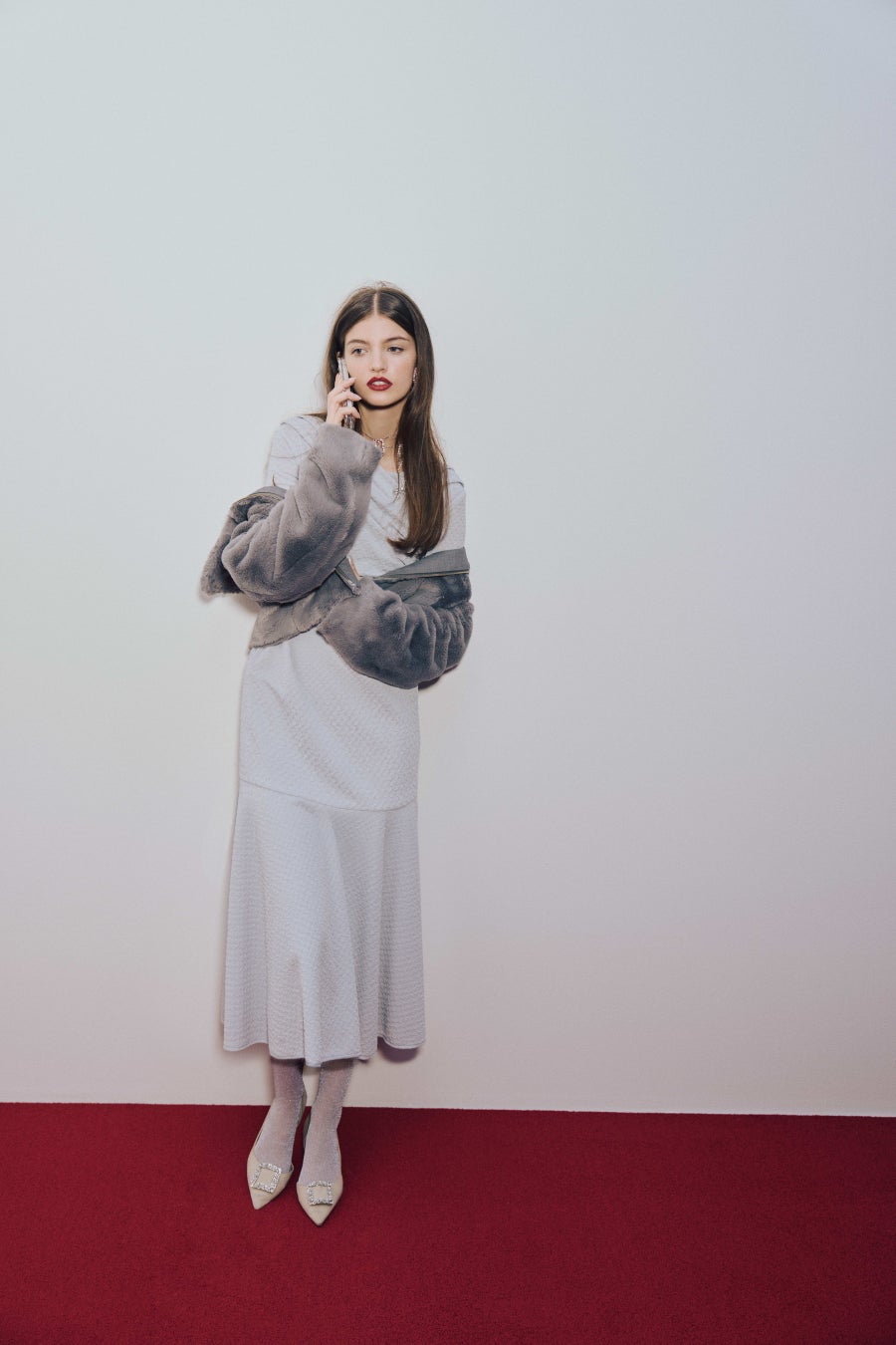 ドレープやギャザーの贅沢なシルエットに肌見せも加え