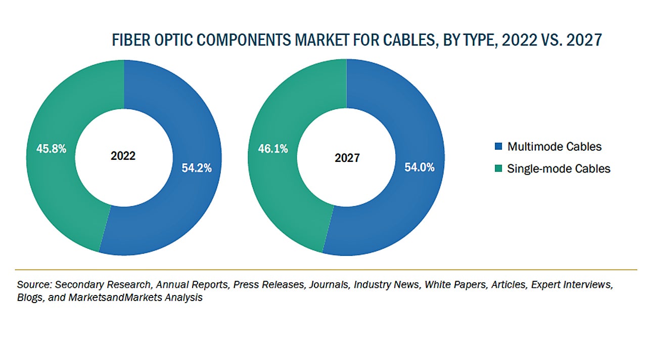 光ファイバーコンポーネントの市場規模は、2022年の245億米ドルからCAGR8.9%で成長し、2027年には375億米ドルに達すると予測されています。同市場の成長を促す主な要因としては、データセンターの導入の増加、インターネットの普及とデータトラフィックの増加、帯域幅に対する需要の高まりなどが挙げられます。また、デジタルサイネージ市場での光ファイバーコンポーネントの採用が増加していること、信頼性の高さから光ファイバーの需要が高まっていること、発展途上国での通信インフラの拡大により、COVID-19状況下で効率的な運用のために需要が高まっていることなどが挙げられます。