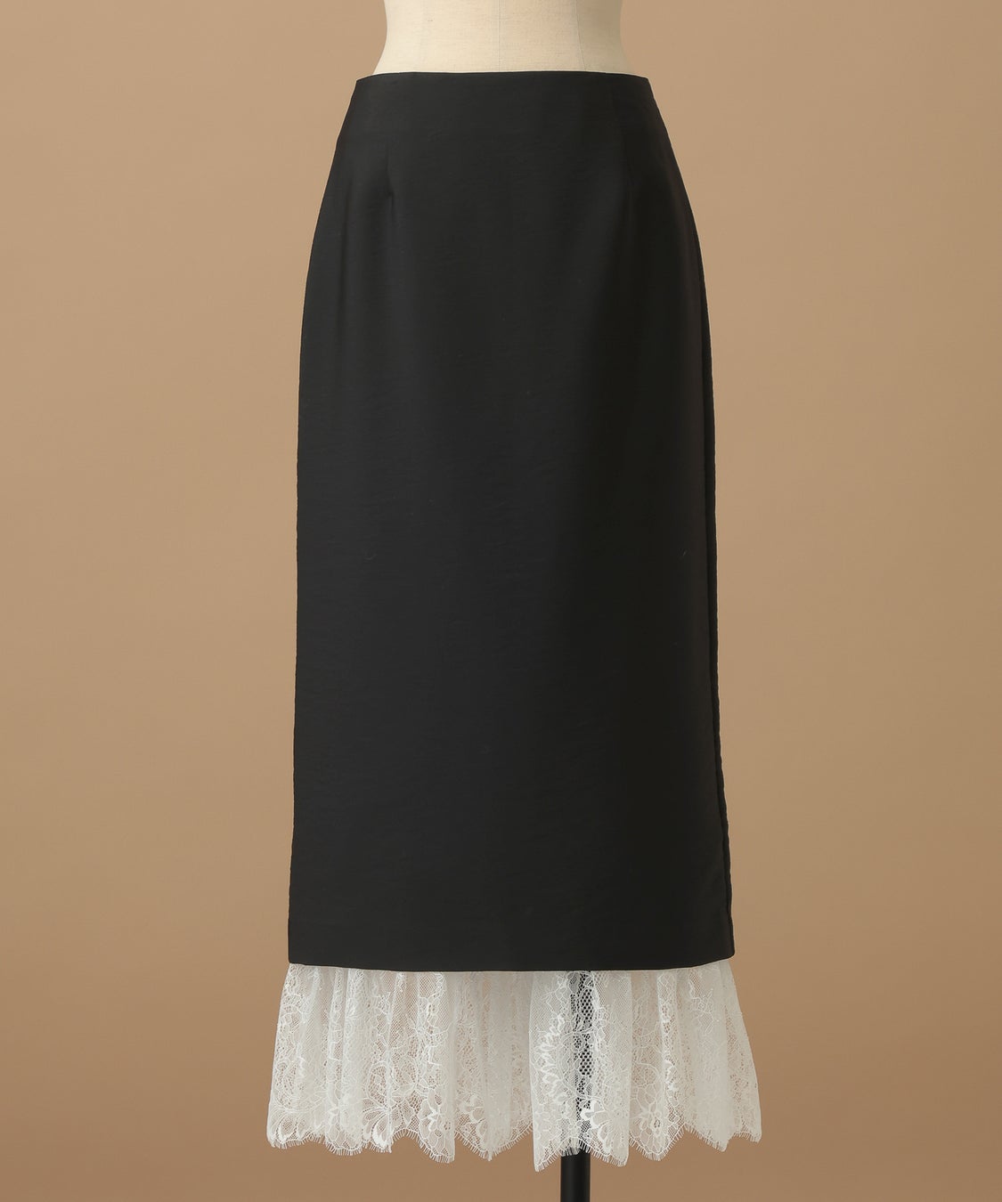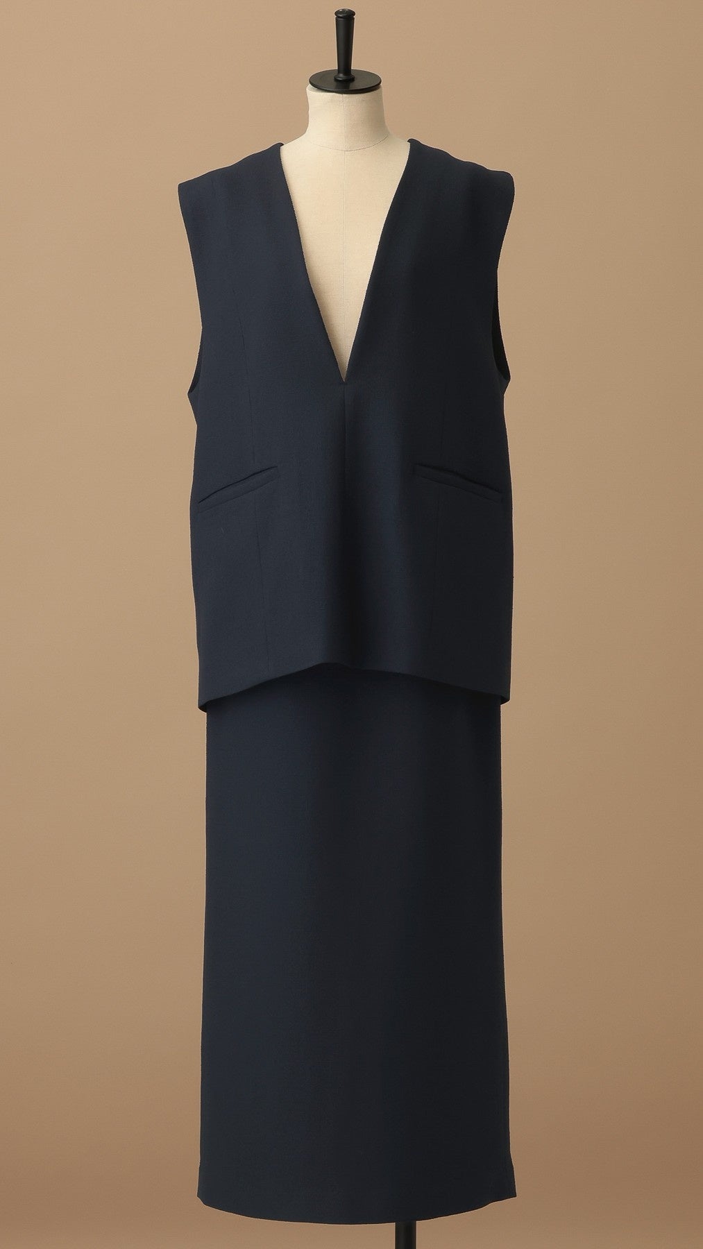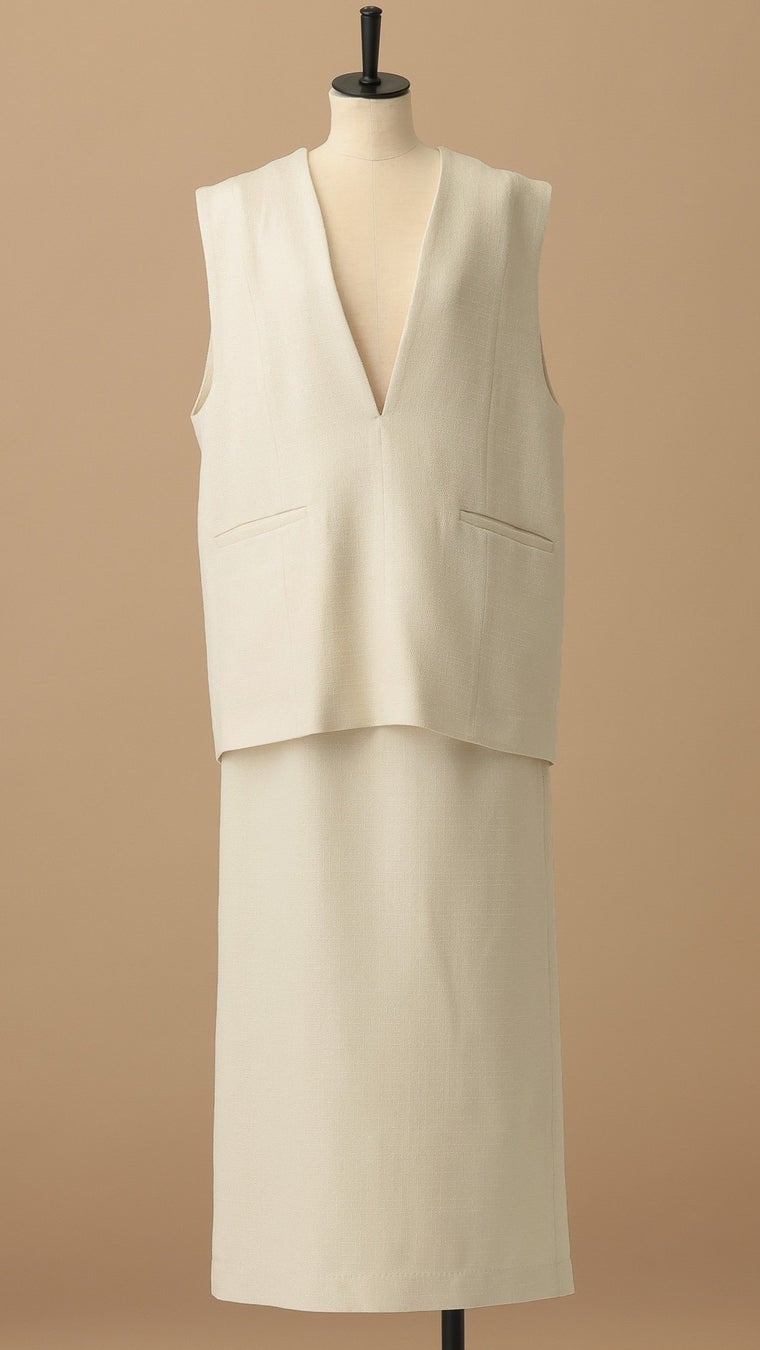 深VネックベストとIラインスカートのすっきりとした甘さのセットアップ。
