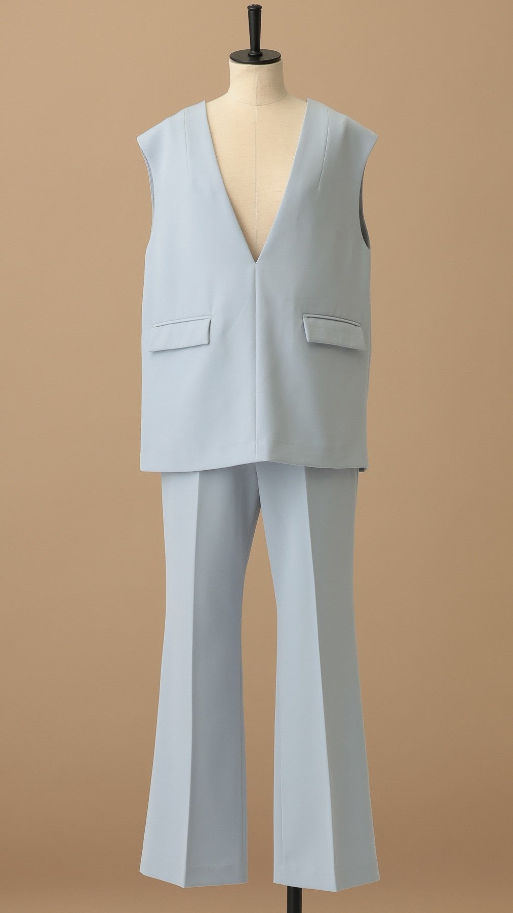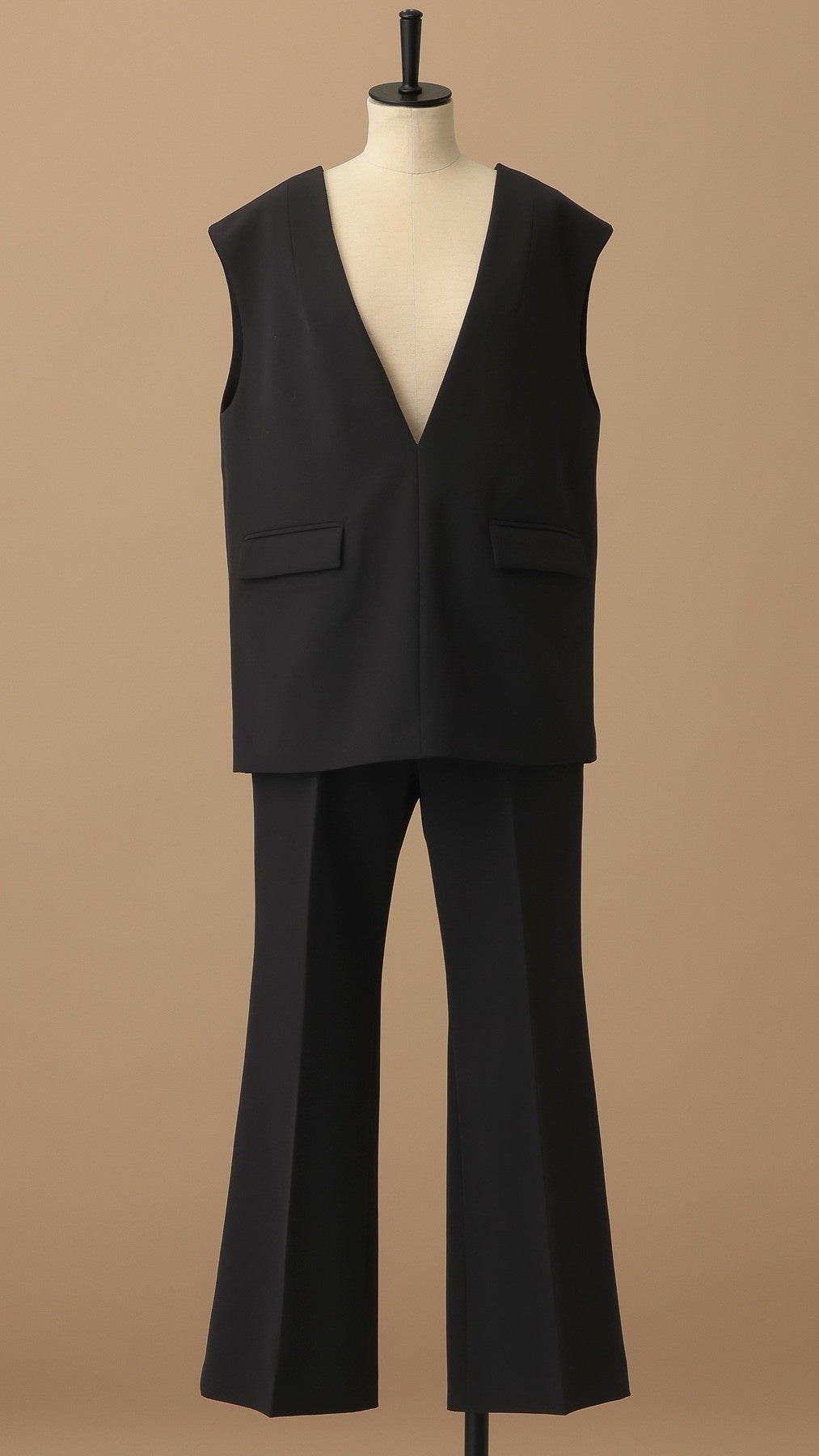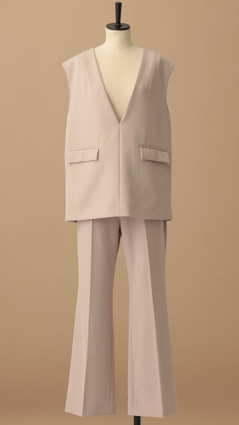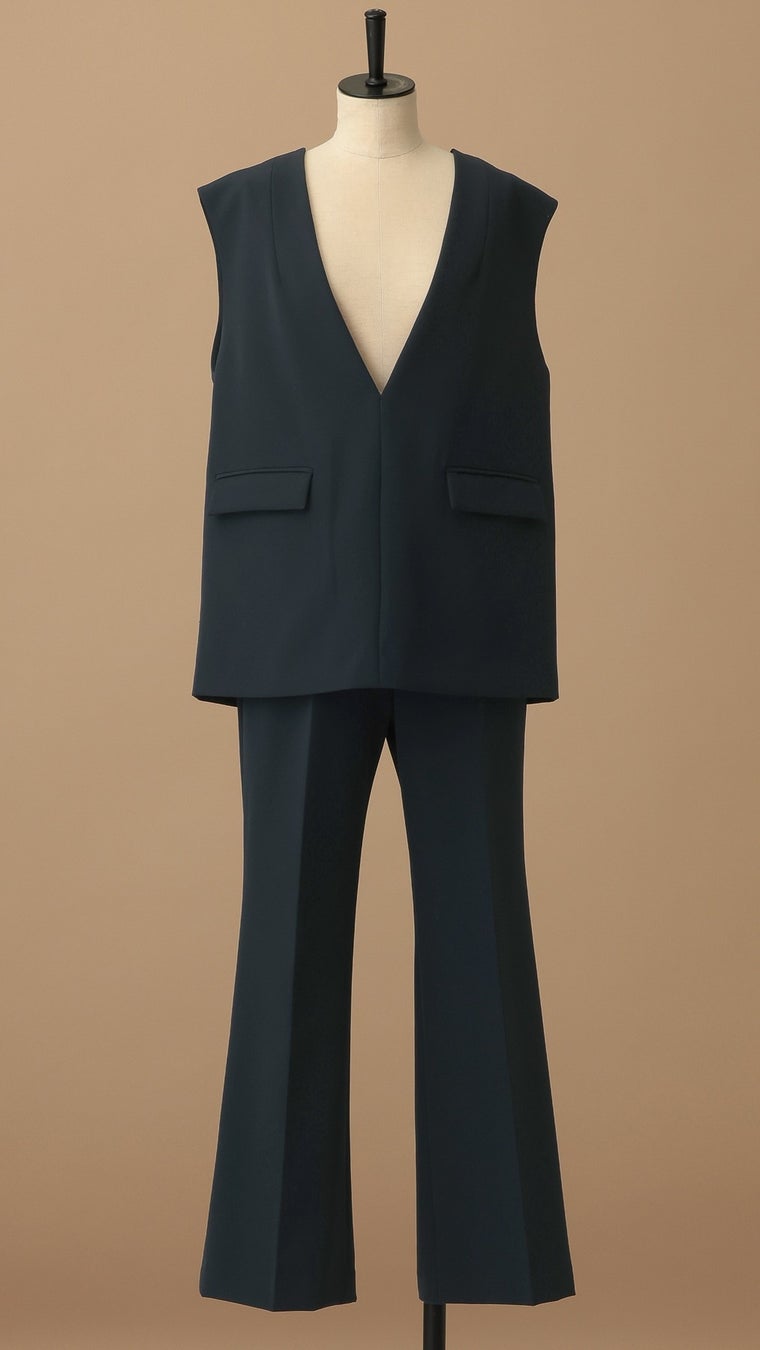 深めのVネックベストとフレアパンツで、スタイルアップを叶えるセットアップ。
