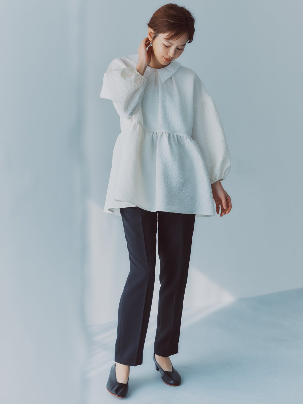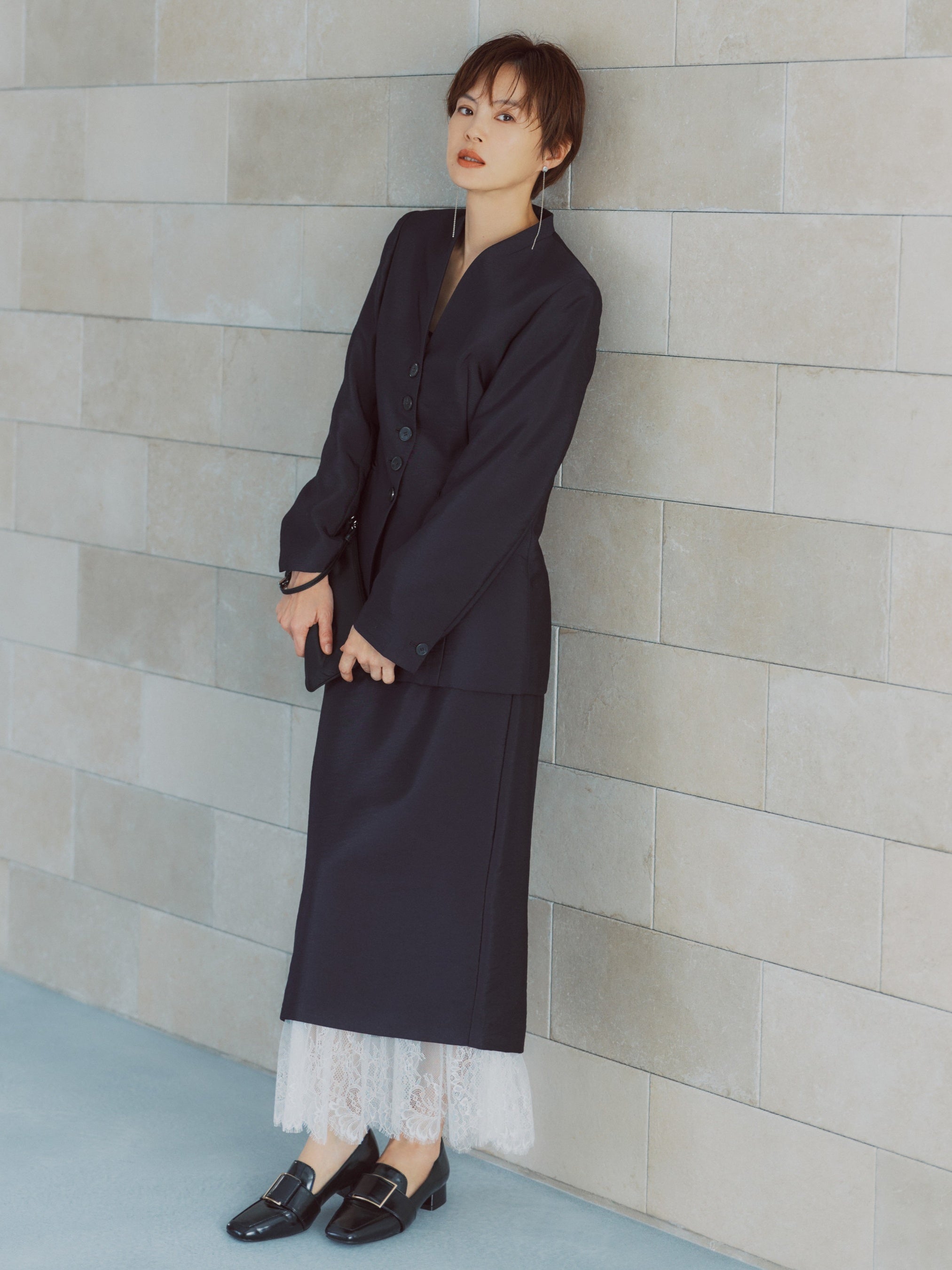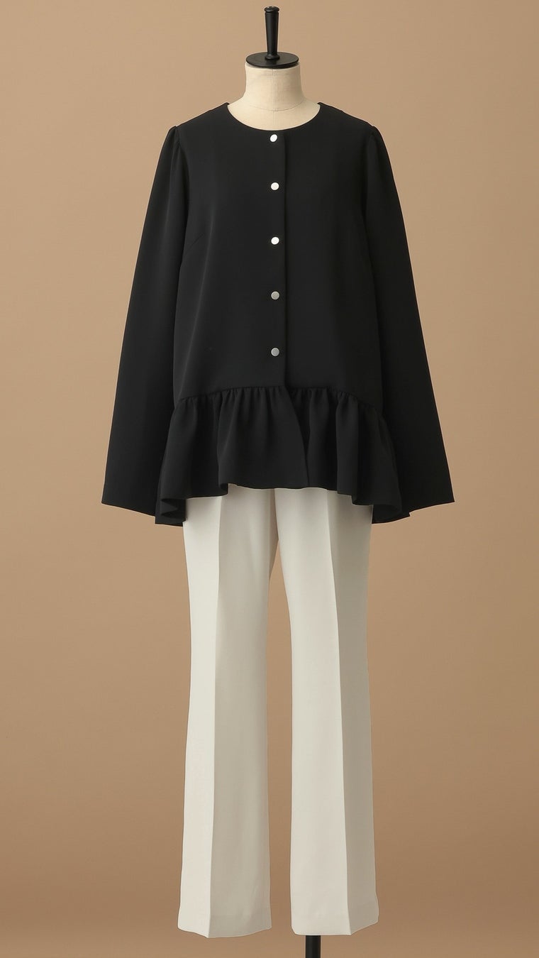セットアップだけでなく、単品でも着映えする華やかなブラウスや、デザイン性にこだわったジャケット、スカートもラインアップ。セレモニーシーンにはきちんと感を、デイリーには程よい華やぎを添え、手持ちのアイテムとも組み合わせやすい一着に仕上げました。