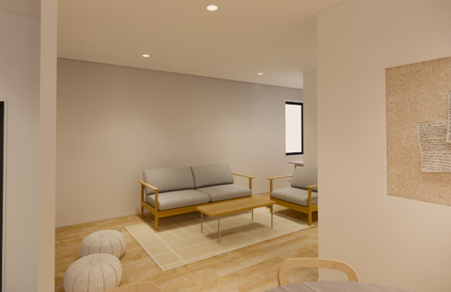 生活空間も隣人とシェアしたい方向けに、居室の設備は最小限にしつつ、隣人とリラックスして過ごせる共用部を併設いたしました。