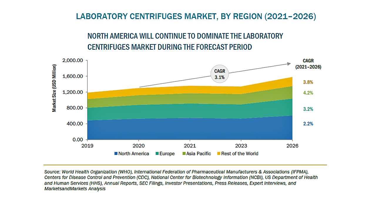 ラボ用遠心分離機の市場規模は、2021年の18億米ドルからCAGR4.0%で成長し、2026年には22億米ドルに達すると予測されています。同市場の成長は、研究開発投資や研究助成金の増加、技術の進歩や革新的なローターデザインの増加、感染症の流行によるラボ用遠心分離機でのサンプル検査や細胞ベースの研究の増加、ラボ用遠心分離機の用途の拡大などにより牽引されています。