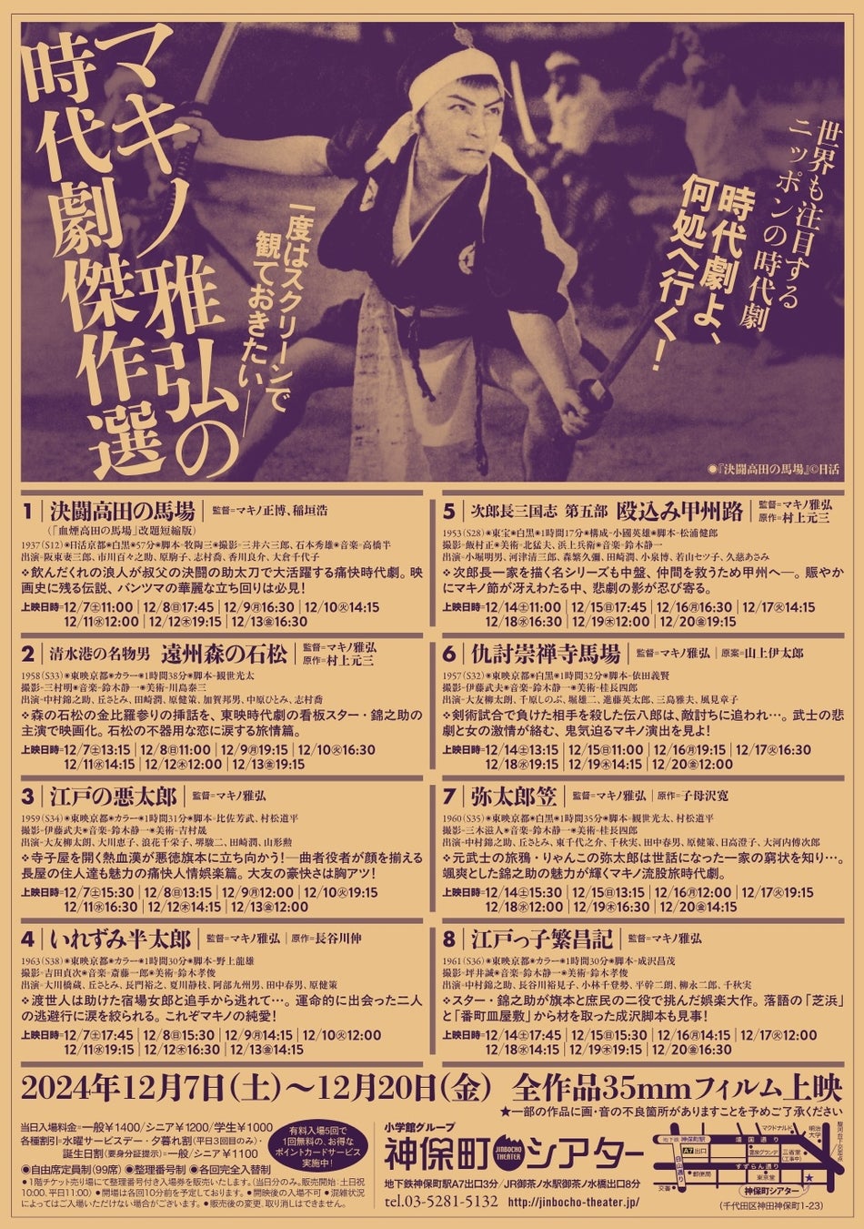 真田広之主演のドラマシリーズ「SHOGUN 将軍」が米エミー賞を総なめにし、日本の時代劇が世界中から注目された今年こそ、改めてその魅力に迫ってみたい――映画ファンが愛してやまないマキノの時代劇を、全作品35mmフィルム上映でお楽しみいただきます。ご期待ください。