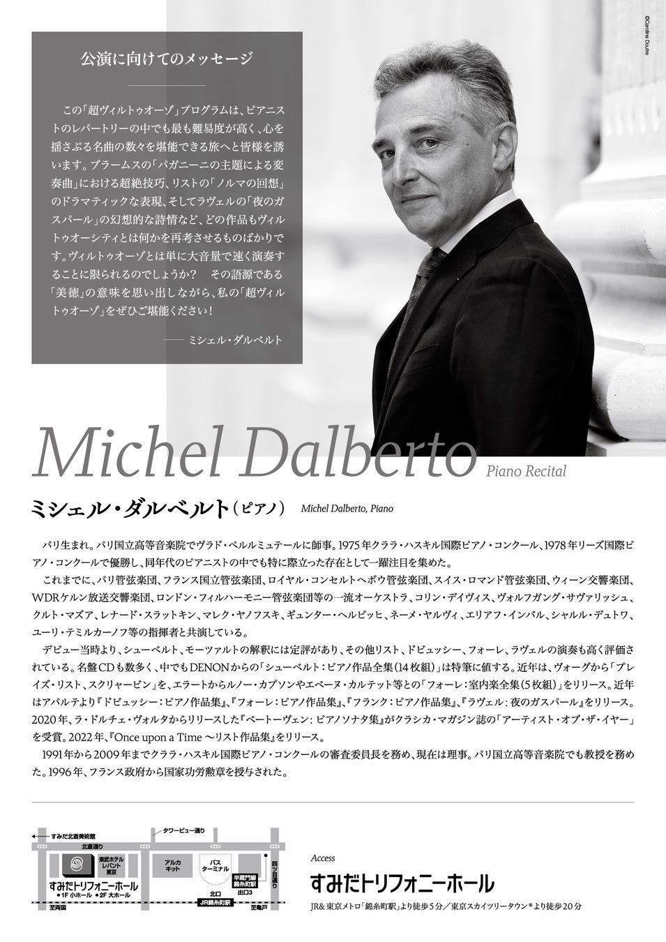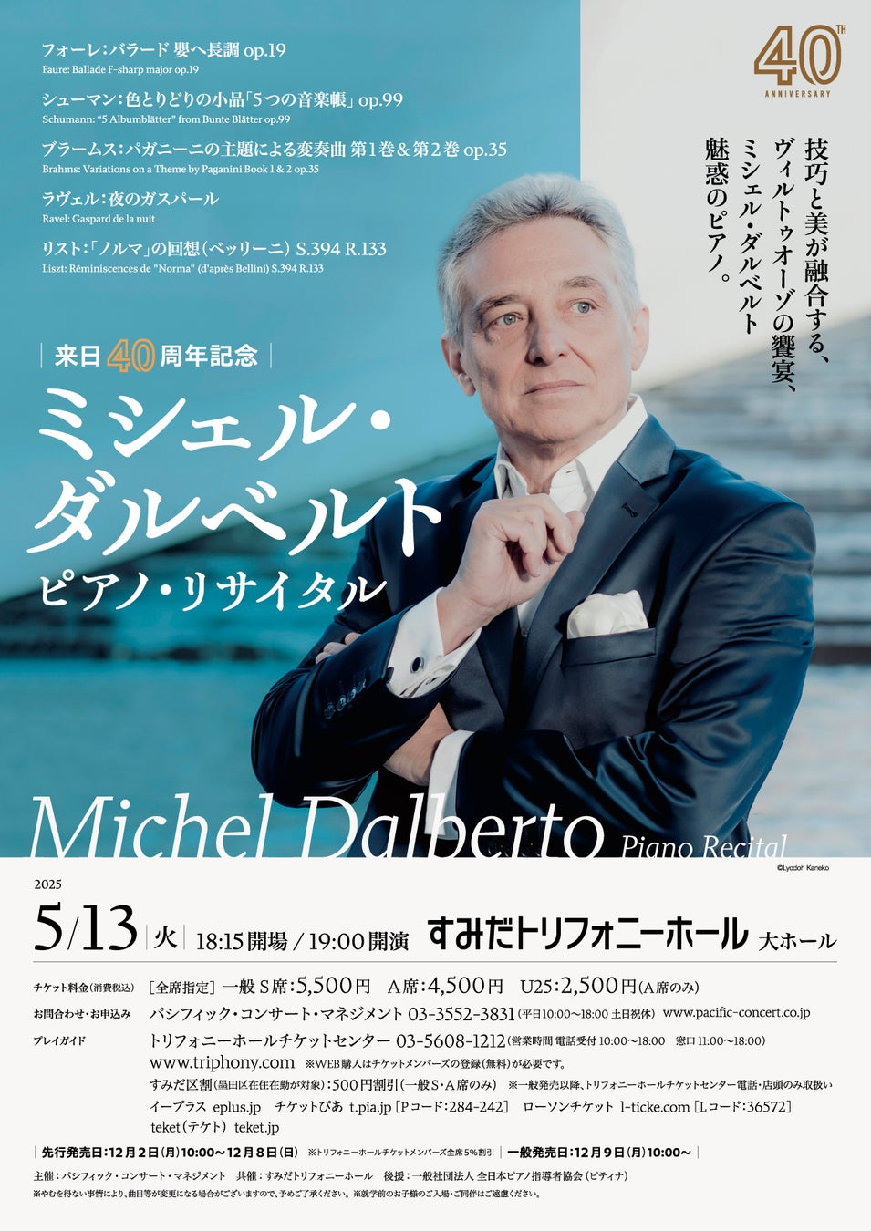 主催:パシフィック・コンサート・マネジメント『【来日40周年記念】ミシェル・ダルベルト ピアノ・リサイタル』が2025年5月13日 (火)にすみだトリフォニーホール 大ホール(東京都 墨田区 錦糸 1-2-3)JR&東京メトロ「錦糸町駅」より徒歩5分にて開催されます。
