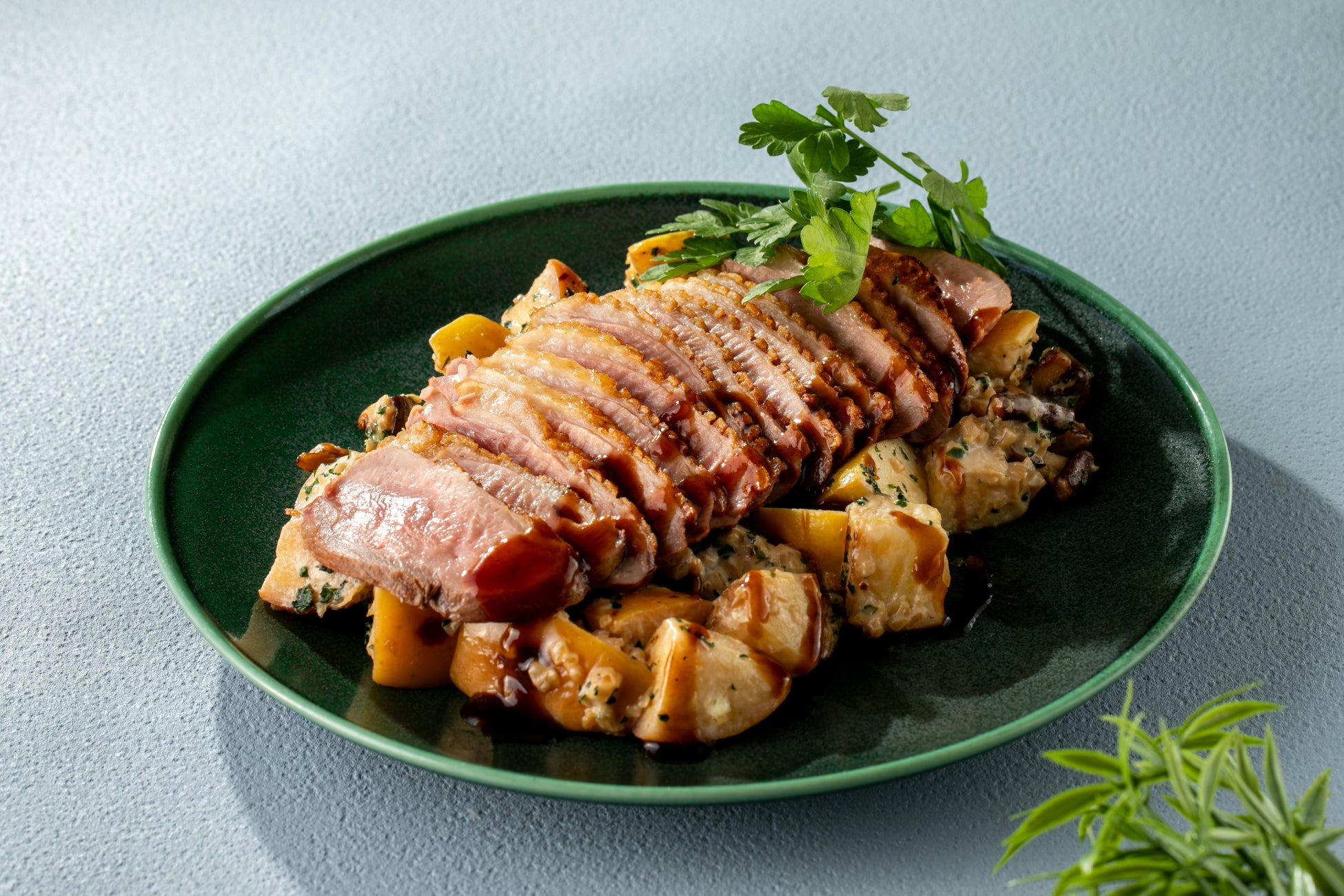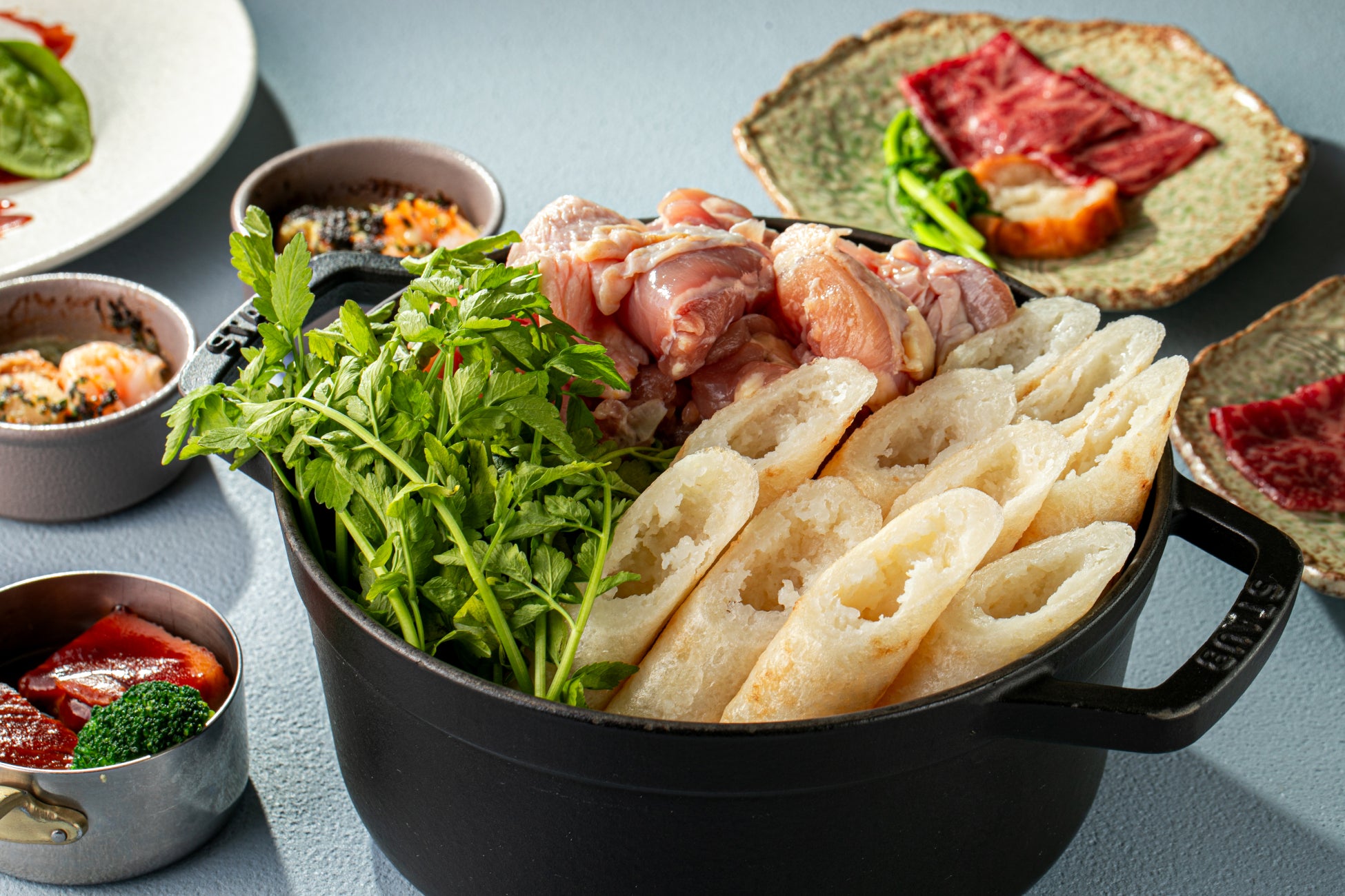 明治時代より伝わる仙台を代表する特産物「山形屋仙台麩」を使用した“山形屋仙台麩と和牛焼きしゃぶ”や、秋田を代表する郷土料理“きりたんぽ鍋”、 “青森県産りんごときのこのフリカッセ 鴨肉のポワレ バルサミコソース”や、“豚となすの仙台味噌のピリ辛炒め”など、和・洋・中のお料理からスイーツまで、東北の食を存分に味わえる多様なメニューを取り揃えております。
