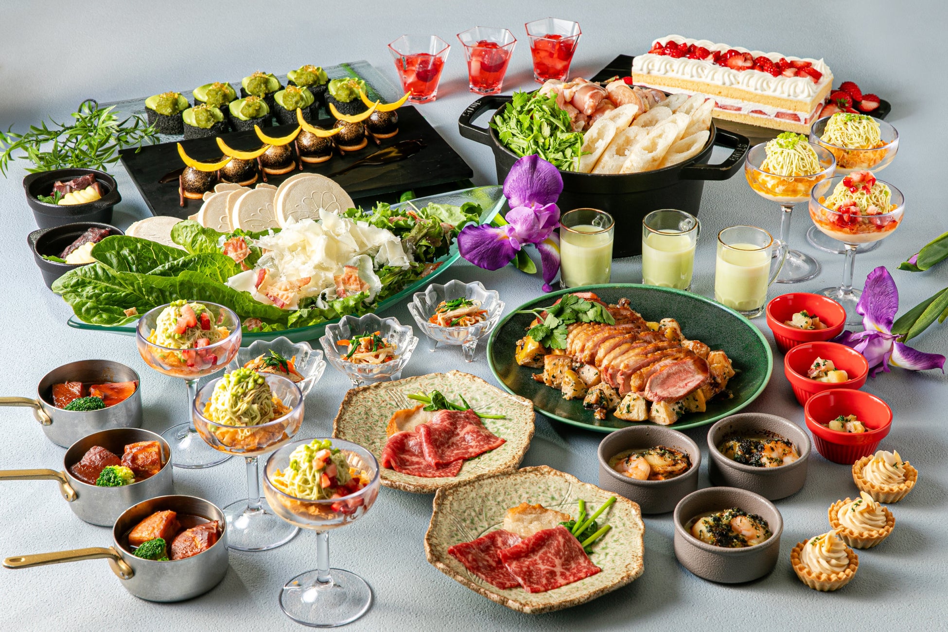 おかひじきともやしとチキンのナムル/宮城県ヤマカノ醸造 登穀味噌とクリームチーズのタルト アーモンド添え/山形屋仙台麩と和牛の焼しゃぶ/三陸産めかぶとしらすのペペロンチーノ/ホタテと海老の三陸産ワカメオリーブオイルバター焼き/山形県天元豚ロースのグリル 和風オニオンソース/青森県産りんごときのこのフリカッセ 鴨肉のポワレ バルサミコソース/白身魚のオーブン焼き 三陸産ムール貝 軽いバターソース/秋田名物 きりたんぽ鍋/福島笹の川酒造ブレンデッドウイスキー山桜のポークブレゼ/山形県産高畠ワイナリー高畠醸ルージュ香るチキンのコック・オ・ヴァン/東北名物 いも煮 ヤマカノ醸造登穀味噌/蒸し野菜 青森県産黒にんにくのバーニャカウダーソース/ミニどんぶり(サーモンマヨネーズのミニ丼、ミニバラちらし、ミニ穴子飯)/盛岡名物冷麺/豚となすの仙台味噌のピリ辛炒め/気仙沼産フカヒレ入りあんかけチャーハン/ジャージー牛乳のアイス ずんだとチーズのモンブラン仕立て など
