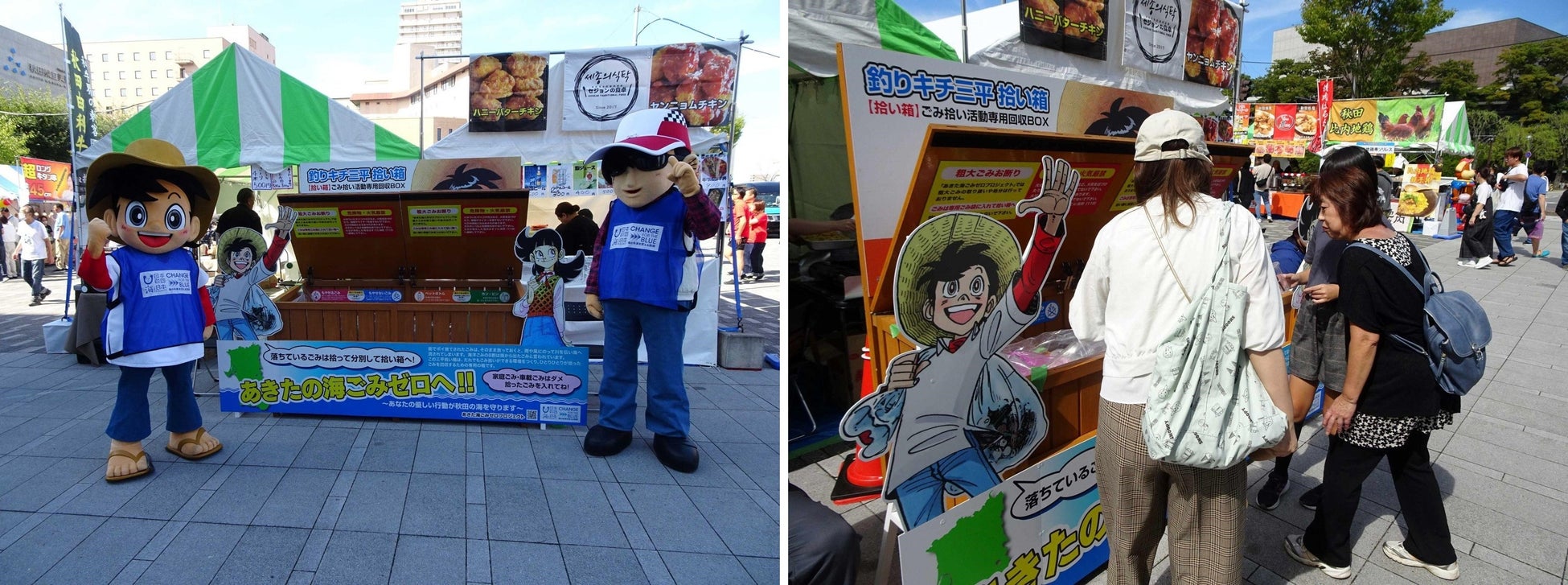 拾い箱前ではごみの分別を呼び掛けたり、CHANGE FOR THE BLUEオリジナルごみ袋を会場の方々に配布するなど、あきたの海ごみゼロ活動に頑張る三平くんと魚紳くん。2人の周りには、「釣りキチ三平だ」と懐かしむ大人はもちろん、三平くんを知らない子供たちも「かわいい」とたくさん集まり、三平くんとハグをしたり、写真撮影やハイタッチをするなど大人気。三平拾い箱の前では、拾い箱の中をのぞきこんだり、矢口先生の描いた貴重な画を懐かしそうに眺める大人などが見受けらました。来場者の中には、配布されたごみ袋を使って会場周辺のごみ拾いを行い、拾い箱で分別しながらごみを捨ててくれる家族連れや子供達もいたことから、少しずつ県民のごみに対する意識が向上してきていることを感じました。