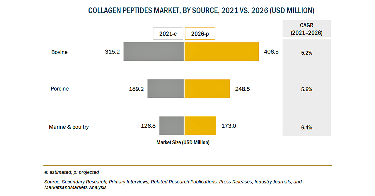 コラーゲンペプチドの市場規模は、2021年の6億3,100万米ドルからCAGR5.6%で成長し、2026年には8億2,800万米ドルに達すると予測されています。ライフスタイルや食習慣の変化、欧米型の食生活の採用、食品・飲料、医薬品、化粧品・パーソナルケア製品、栄養製品など幅広い製品におけるコラーゲンペプチドの機能性成分の需要の増加などが、新興国における同市場の発展に寄与しています。アジア太平洋地域、南アフリカ、中東、南米、東欧諸国などの新興国は、製造プロセスの向上に伴う産業活動の活発化により、コラーゲンペプチド市場の成長に絶好の機会を提供しています。しかし、動物由来の製品を消費することに対する文化的な規制が、今後の抑制要因となっています。
