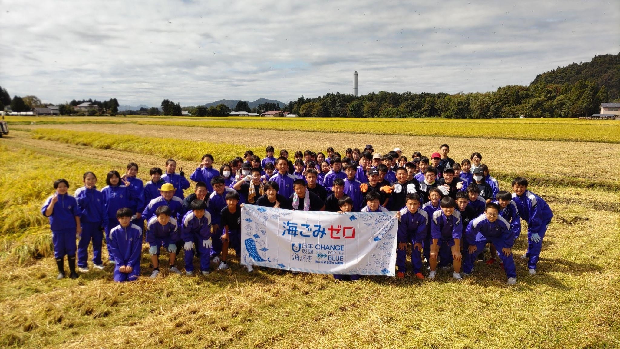 地元の中学生が農業の現場から海洋ごみゼロ宣言!脱プラスチック肥料を使用した米作りで海ごみゼロ宣言!稲刈り篇を開催しました。