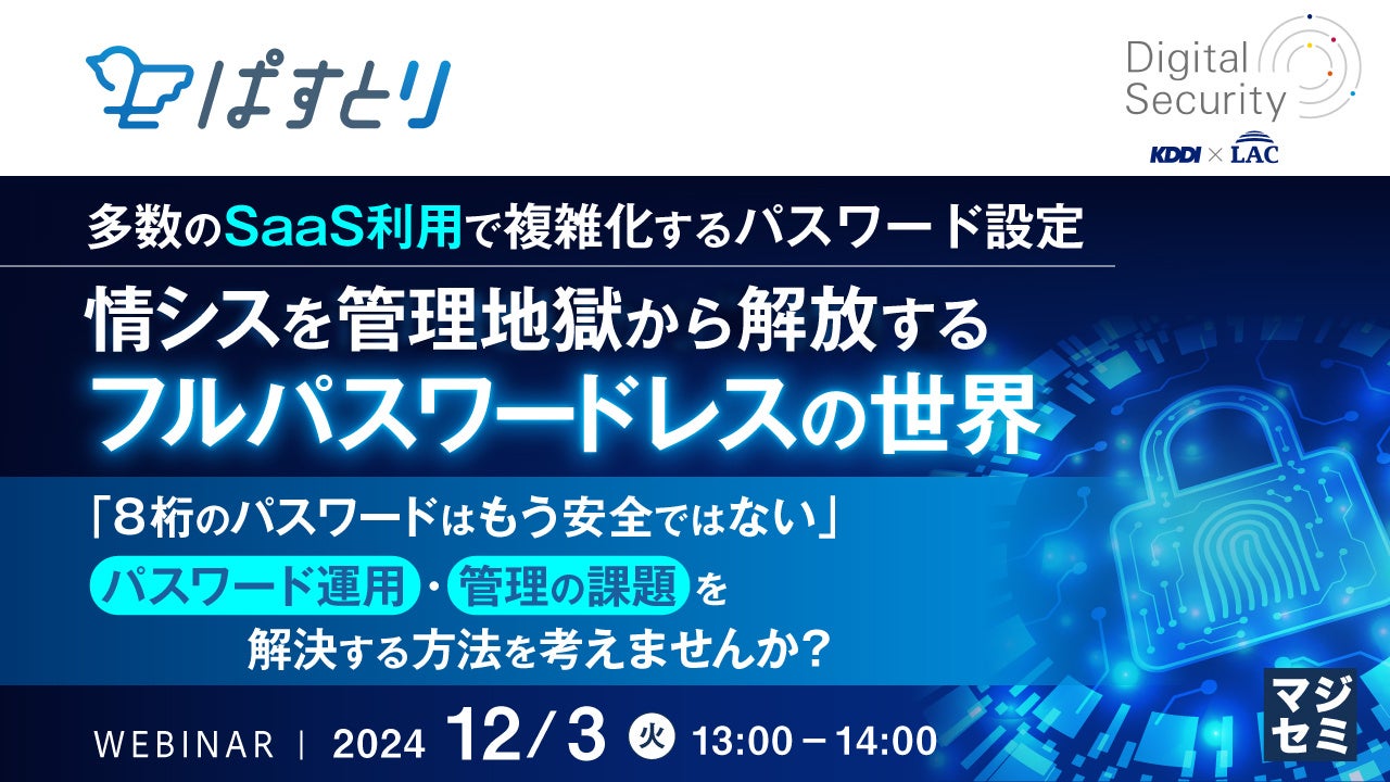マジセミ株式会社は「多数のSaaS利用で複雑化するパスワード設定、情シスを管理地獄から解放するフルパスワードレスの世界」というテーマのウェビナーを開催します。