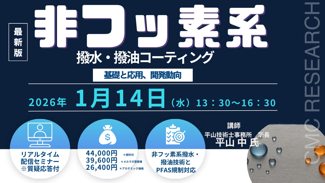 【ライブ配信/ZOOM】「非フッ素系撥水・撥油コーティングの基礎と応用、開発動向」セミナー開催!1月14日(水)主催:(株)シーエムシー・リサーチ
