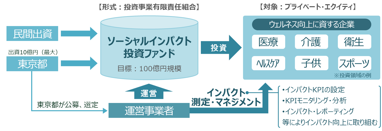 今般、①インパクト投資を促進し、社会課題の解決に官民協働で取り組む新しい金融の流れを加速すること、②「東京で暮らす人々のウェルネス」を向上し誰もが心身ともにいきいきと暮らせる社会づくりに貢献すること、の2点を目的として、ソーシャルインパクト投資ファンドを創設し、運営する事業者を下記の通り募集します。