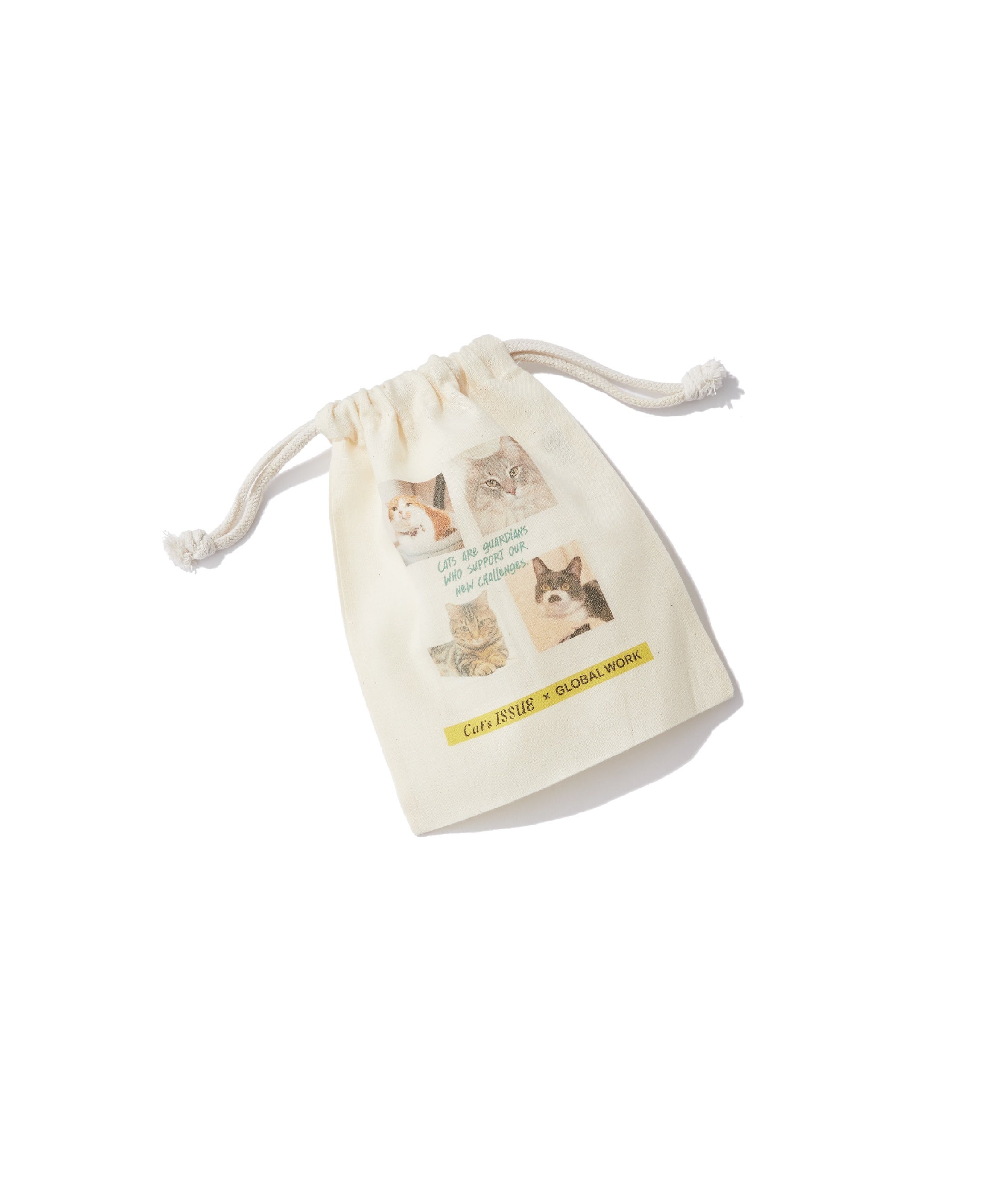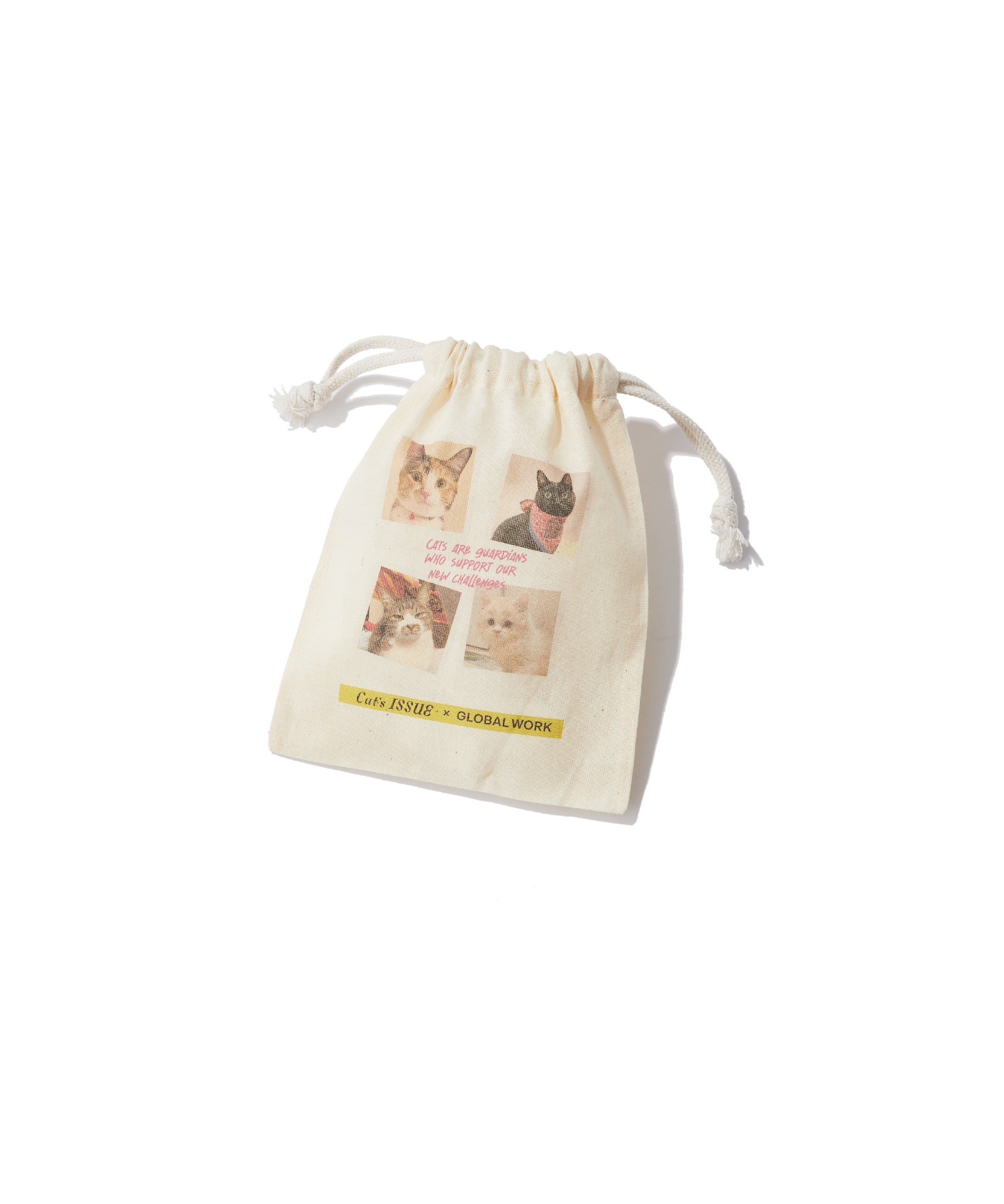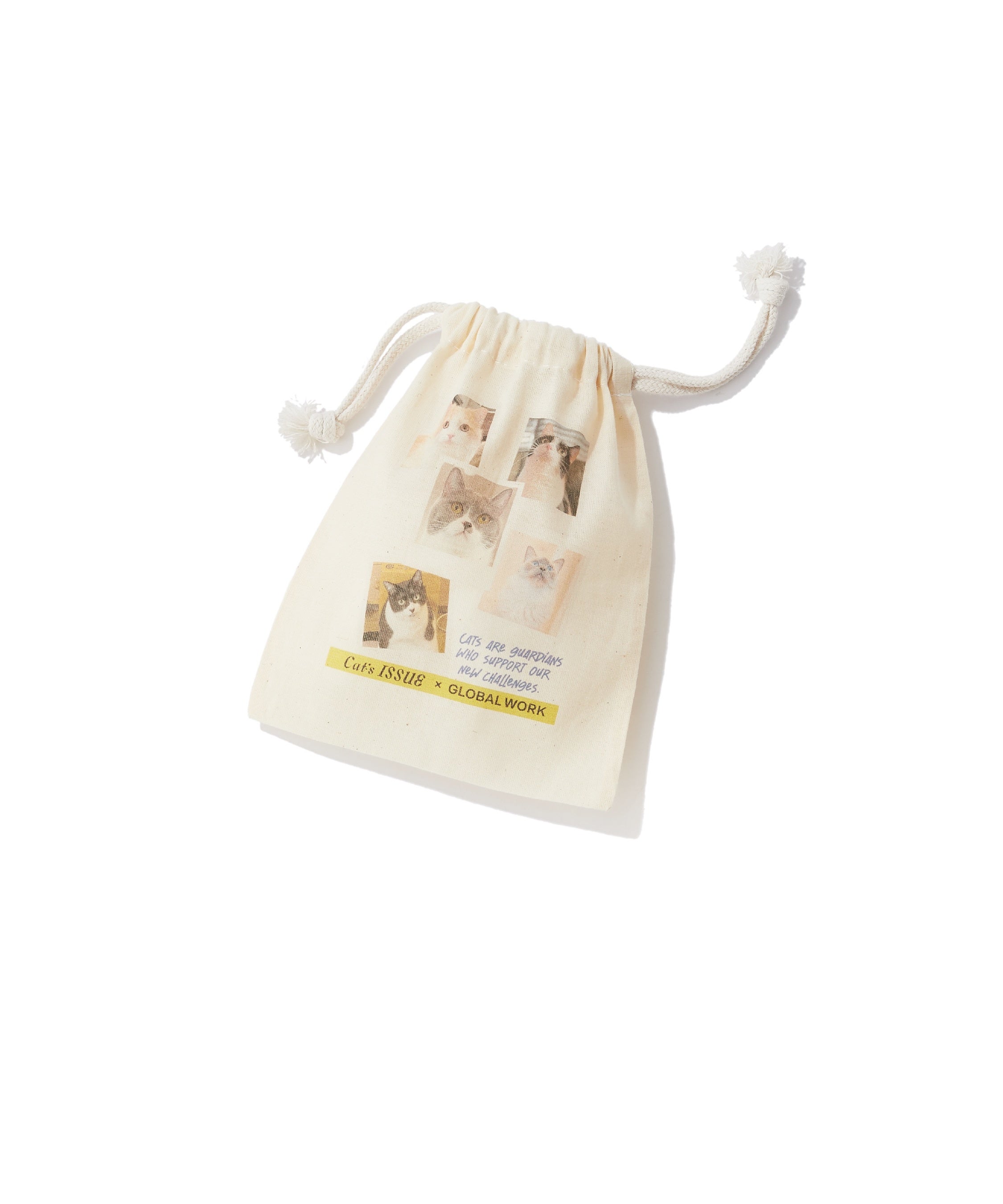 キャンペーン期間中、「Cat’s ISSUE」コラボレーションアイテムを1点以上お買い上げいただいたお客さまに、GLOBAL WORKショップスタッフの愛猫をプリントしたオリジナル巾着」をプレゼントいたします。100枚以上の応募写真の中から厳選した、個性豊かな猫ちゃんたちをプリントした全3種のデザインを用意。(※配布はランダムとなります。各店、なくなり次第終了となります。)