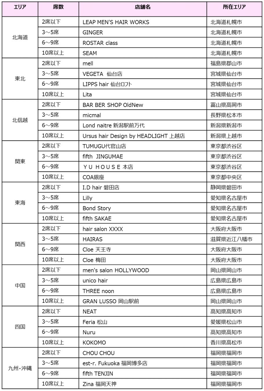 全国9ブロック(北海道、東北、北信越、関東、東海、関西、中国、四国、九州・沖縄)×席数4区分(2席以下、3~5席、6~9席、10席以上)ごとに『ホットペッパービューティー』経由のネット予約売上総額により受賞サロンが決定しています。(集計期間:2024年1月1日(祝)~12月31日(火)の来店ベース売り上げ)