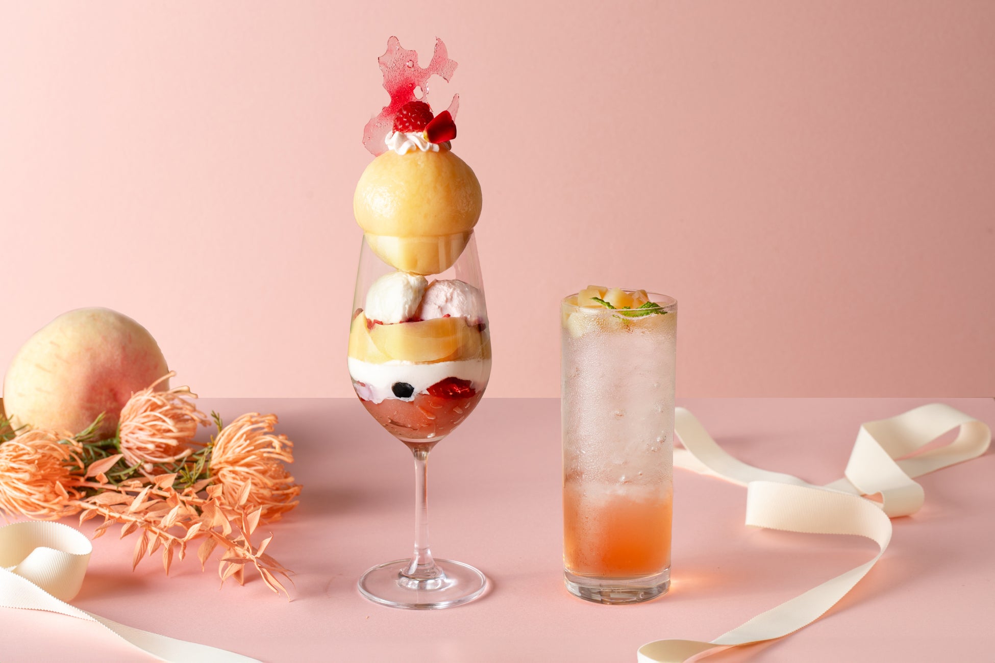 桃の魅力をぎゅっとつめこんだ、至福の桃色パフェ。