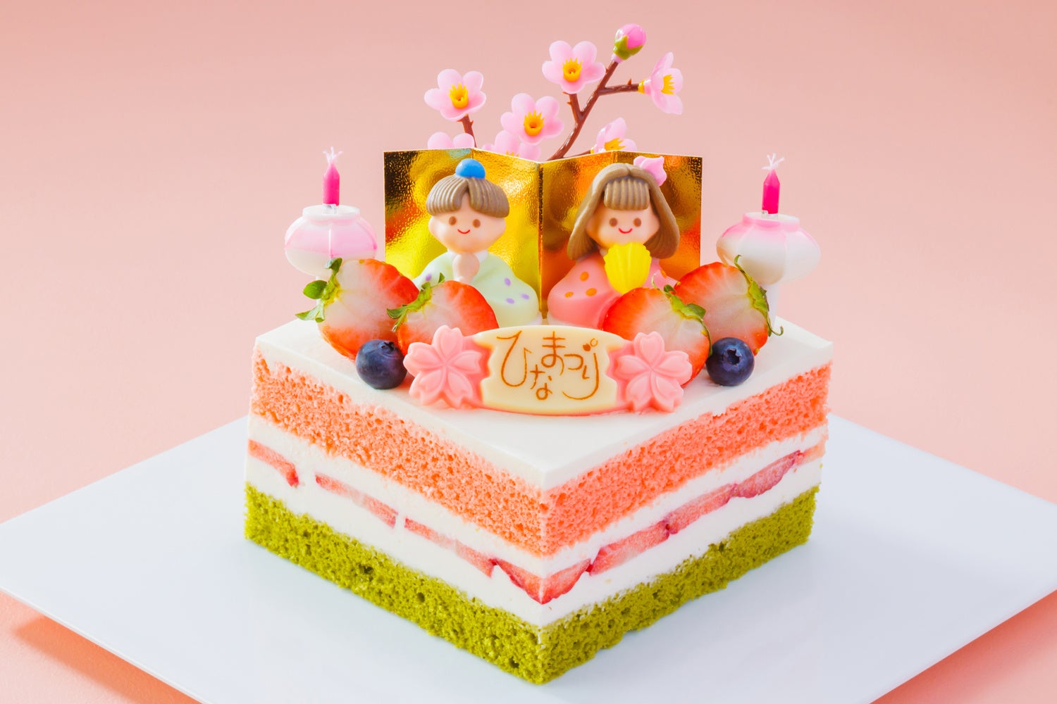 苺の風味がふんわり香るピンクのスポンジと、小さなお子様でも食べやすいよう苦みを抑えた抹茶のスポンジで、お子様も大好きなたっぷりの生クリームと国産の苺を挟んだケーキは、きめ細やかなスポンジと口あたりの良いクリームの相性が抜群です。仲良く寄り添うお内裏様とお雛様や、梅、ぼんぼりで可愛らしくデコレーションし、ひなまつりのお祝いの席が笑顔であふれるよう願いを込めました。