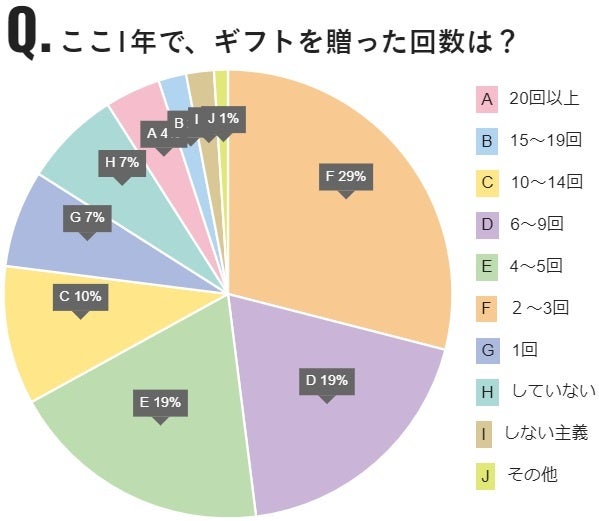 1位は「2~3回」29%、2位が「6~9回」と「4~5回」同率で19%でした。10回~14回は10%、15回~19回は2%、20回以上は4%と、10回以上ギフトをする人は16%程度あり、「ほんのき」が提案する「ちょっとした贈りもの」も楽しんでいる可能性が伺えます。トータルとして、年に1回でもギフトをする人ととらえると9割りの人がギフトを贈っていることがわかります。フリーアンサー・コメントからは、あらゆる記念日に贈りものをする人、誕生日に贈る人、毎月気づいたら贈りものをしているという人まで様々です。贈りものをするときに使うカードやラッピンググッズをいろいろ楽しんでいるという人もありました。