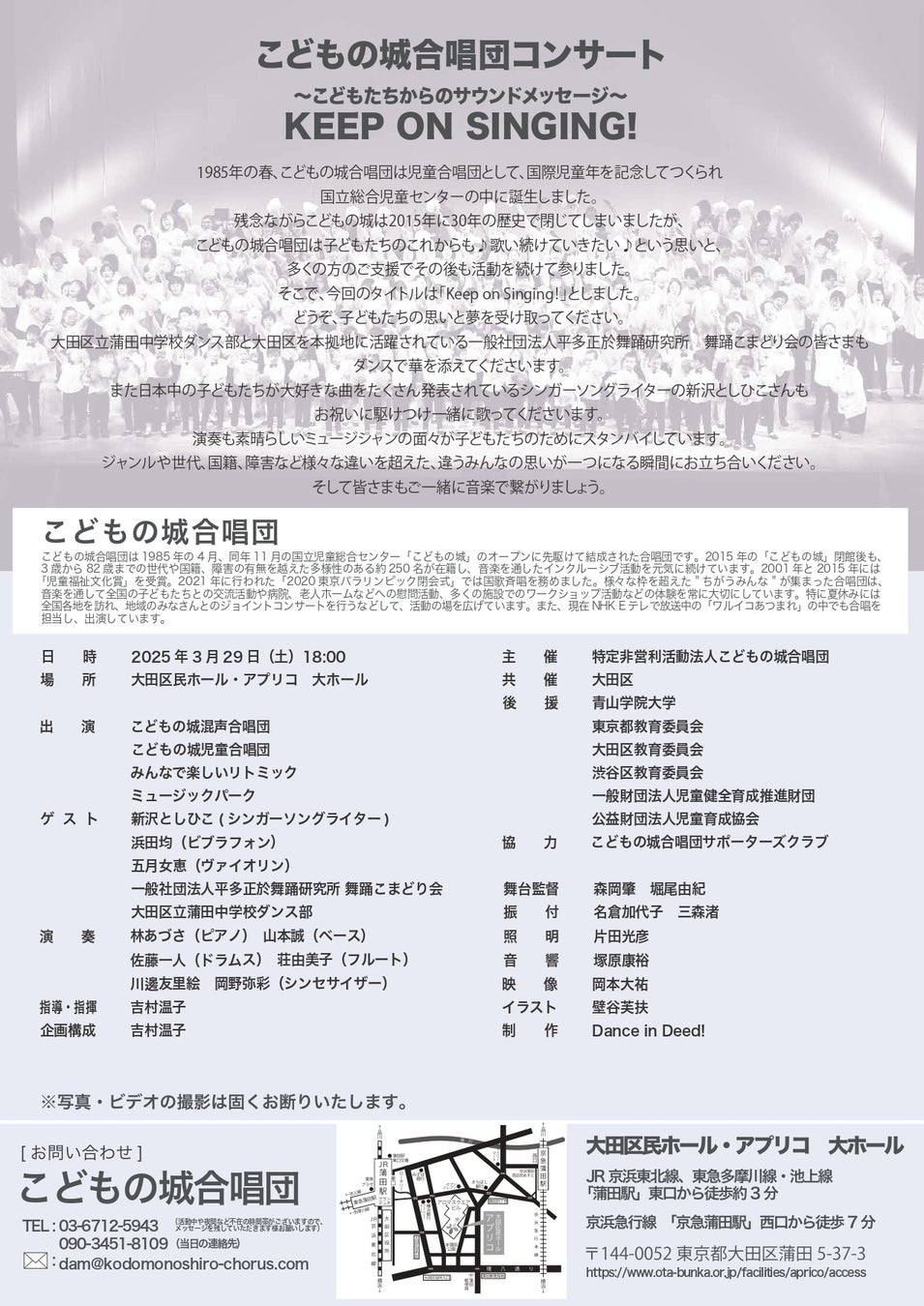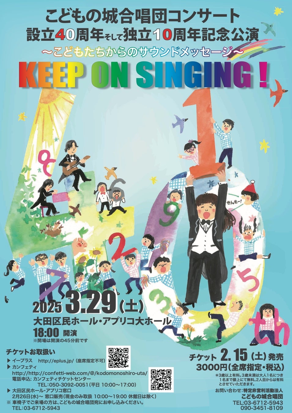 こどもの城合唱団コンサート 設立40周年そして独立10周年記念公演『こどもたちからのサウンドメッセージ〜Keep on Singing!〜』が2025年3月29日(土)に大田区民ホール・アプリコ大ホール(東京都大田区蒲田5丁目37−3)にて開催されます。