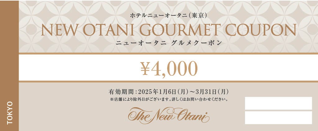 ホテルニューオータニ(東京)では、2024年9月に迎えたホテル開業60周年を記念して、1枚3,500円で購入いただくと、4,000円分相当でご利用いただける「ニューオータニグルメクーポン」を、2025年1月31日(金)までの期間限定で販売いたします。