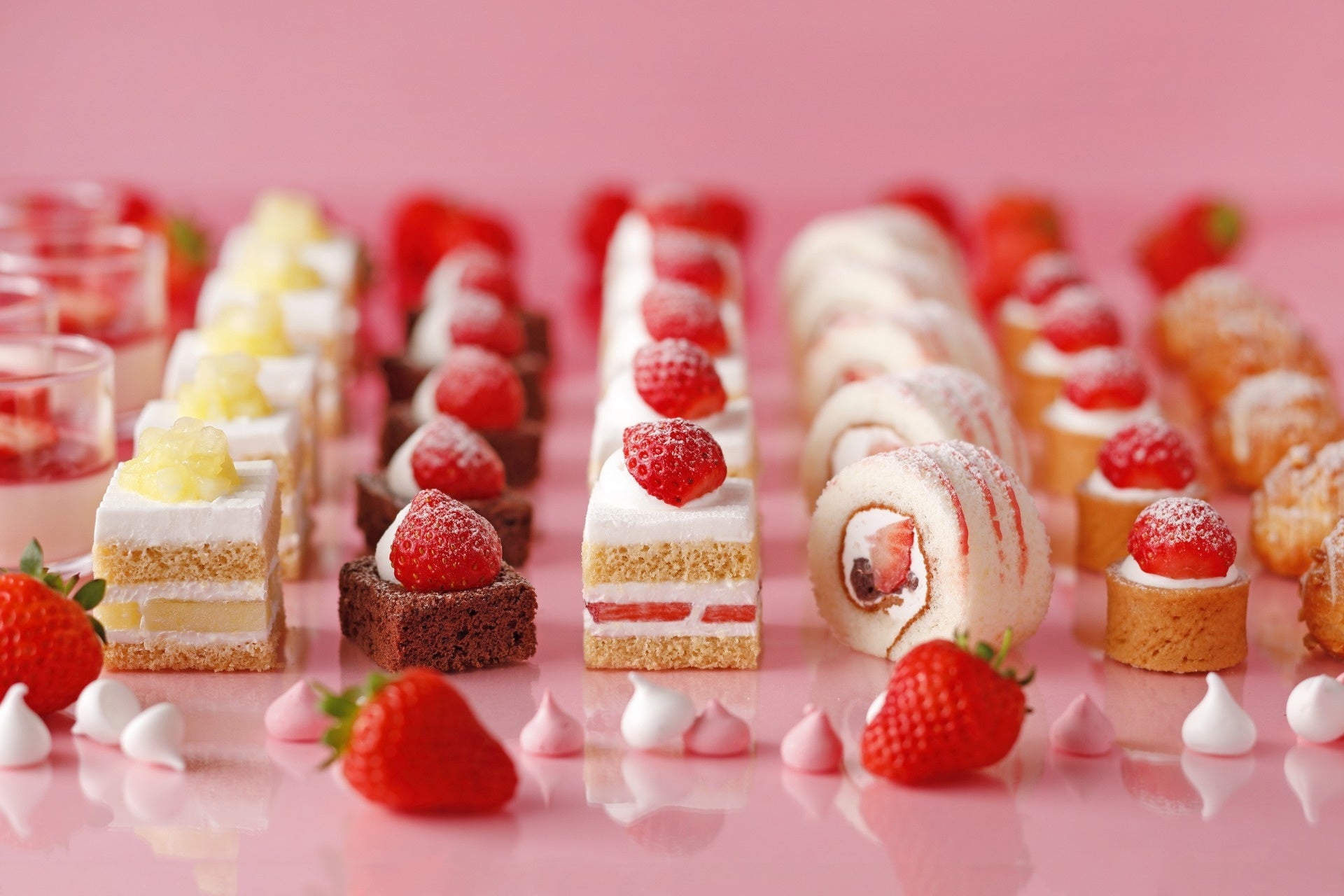 約1万坪の広大な日本庭園を臨む抜群の眺望とともに、旬のフルーツを使用した豊富なスイーツと料理がお愉しみいただける、ガーデンラウンジの『スーパースイーツビュッフェ』。1月は“あまおう”をテーマに、シグネチャースイーツの「スーパーあまおうショートケーキ」をはじめ、「あまおうロール」や「あまおうタルト」、「あまおうゼリー」など、至極のあまおうスイーツを含む約20種のスイーツをお愉しみいただけます。