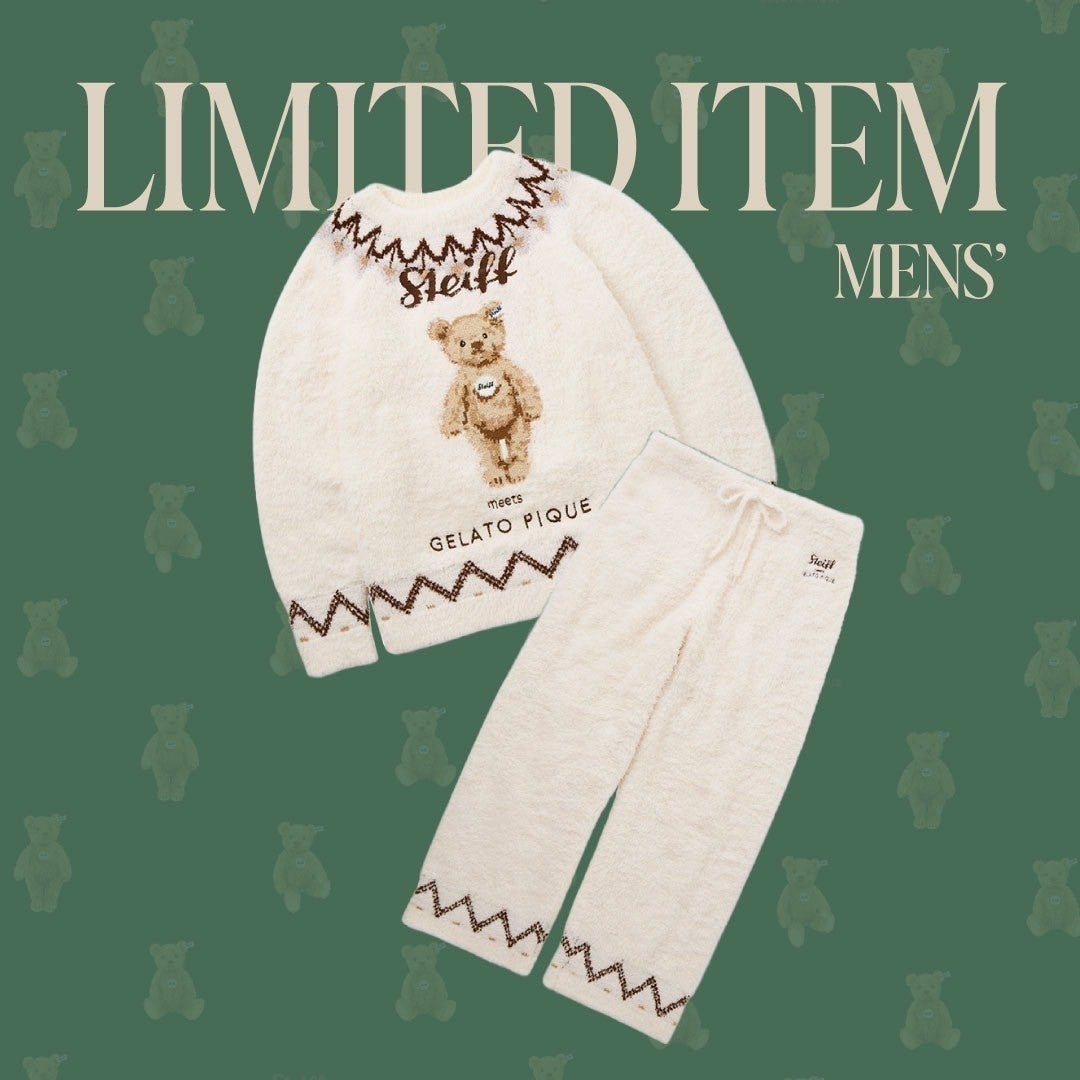 GELATO PIQUE CHRISTMAS GIFT MARKET 2024・CHRISTMAS LIMITED SHOPの限定アイテムとして「Steiff」の故郷である南ドイツの⼩さな町ギンゲンの三⾓屋根の街並みを、あたたかみのあるフェアアイル柄で表現した、レディースのプルオーバー&ショートパンツセットやミニワンピース、ブランケット、メンズはプルオーバー&ロングパンツセットを限定でご用意しています。