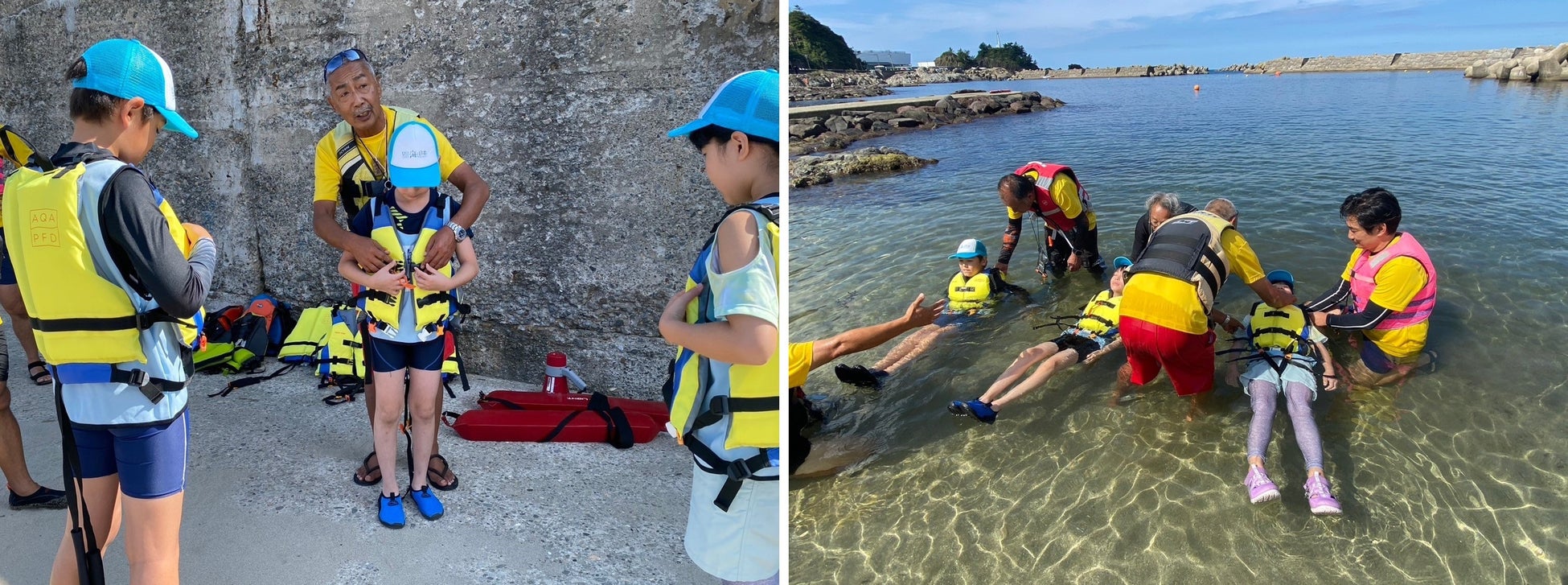 はじめに、子どもたちが、海での注意点などの話を聞いた後に、ライフジャケットの正しい着用方法を学びました。実際に海に入り浮いてみて、海の危険についてよく理解し安全に楽しむため、もしもの時のそなえを体感。 この後、子どもたちはインストラクターとして学んだ内容を保護者に教えることを体験します。