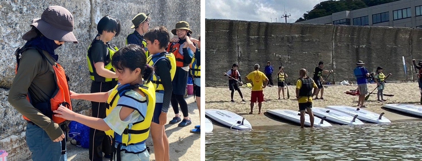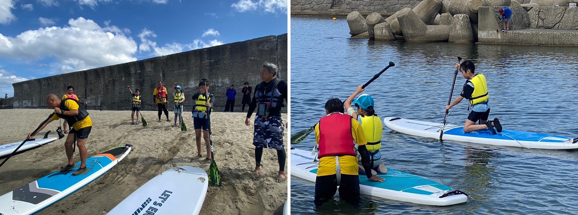 子どもたちのレクチャーのもと、保護者も一緒に海へ出て、実際にSUPに挑戦します。講師の助けを借りながら、インストラクター役の子どもたちの指導により、みんなで沖に出て少しづつ立ち膝から直立へチャレンジし、全員が立てるようになりました。立ってパドルをこぐ難しさを感じながらも、親子で楽しみと自然の魅力を全身で共有する体験となりました。最後にまとめとして、良かったところなどをコメントし合い、インストラクターとしての役割を果たしました。