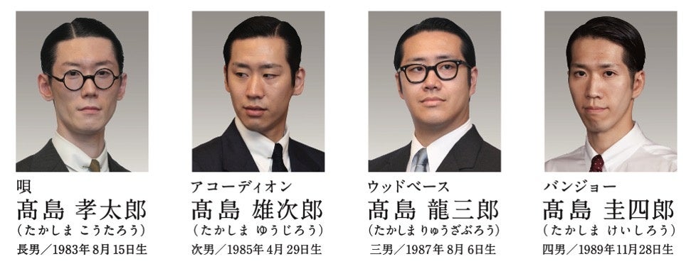 ウッドベース・髙島龍三郎、バンジョー・髙島圭四郎による4人兄弟ユニット。