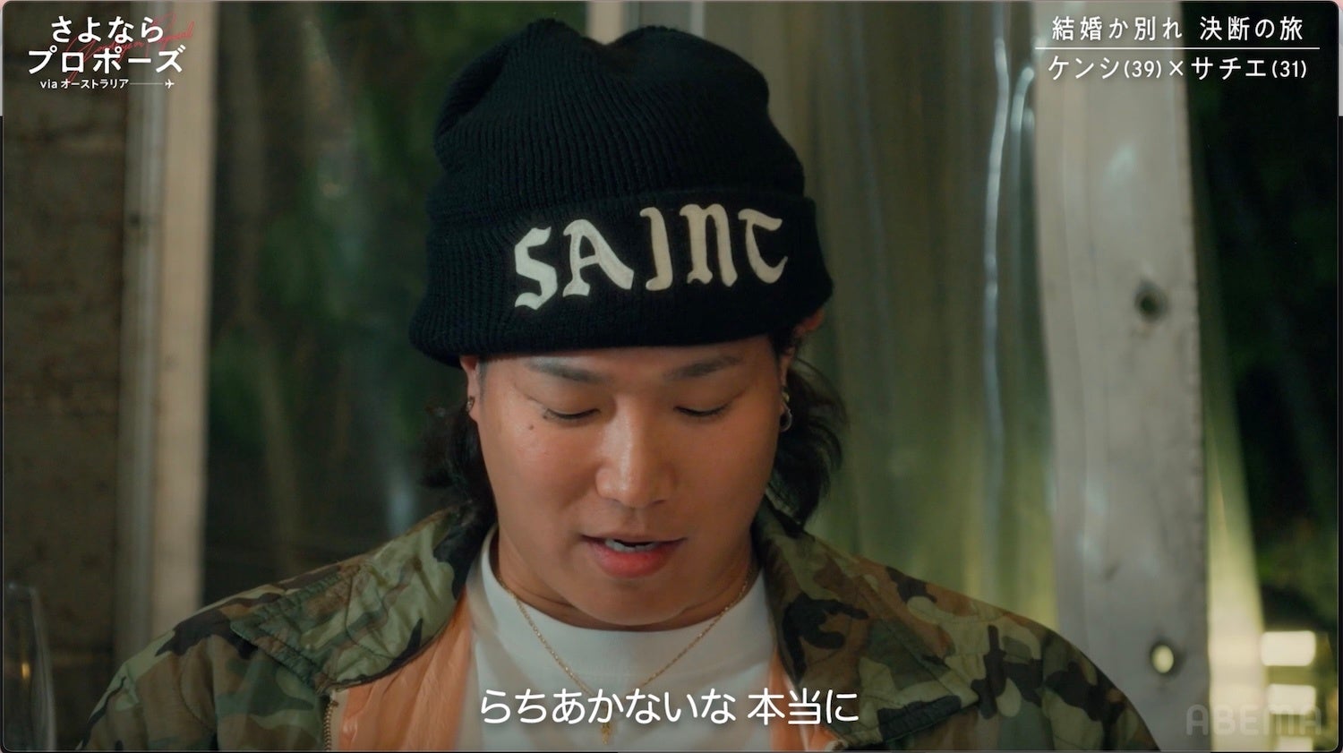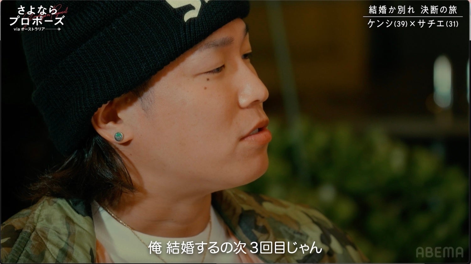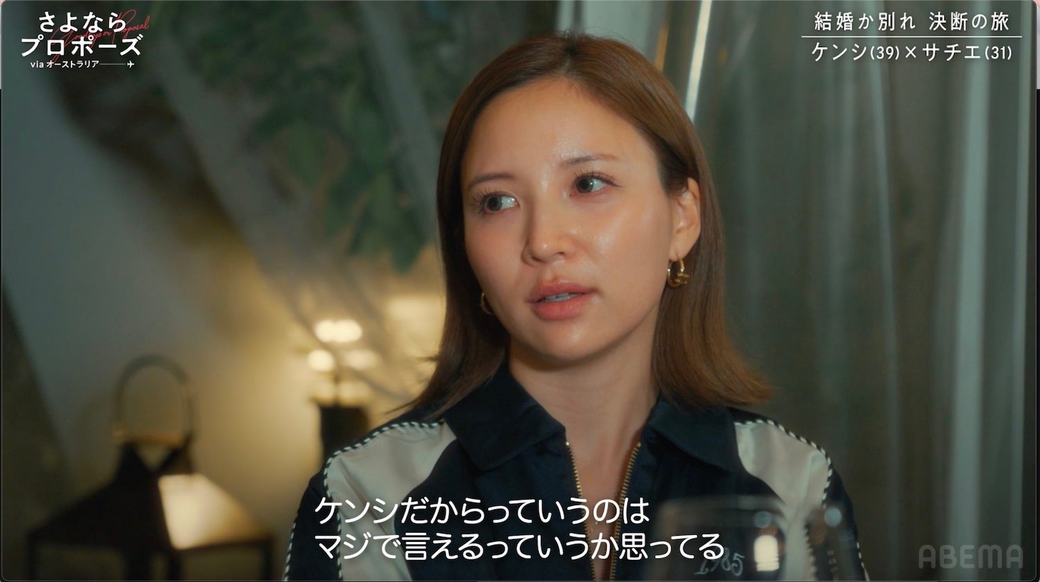 この日のディナーの席で、二度の離婚経験を持つケンシは「俺、今度結婚するの3回目じゃん?2回失敗していて気にならない?20歳くらいの子どももいるけど…」と、自身のバックボーンについて改めてサチエに問いかけました。サチエは「他の人ならすぐ別れていると思う。でもケンシだから一緒にいる。必要不可欠な存在」と口にします。