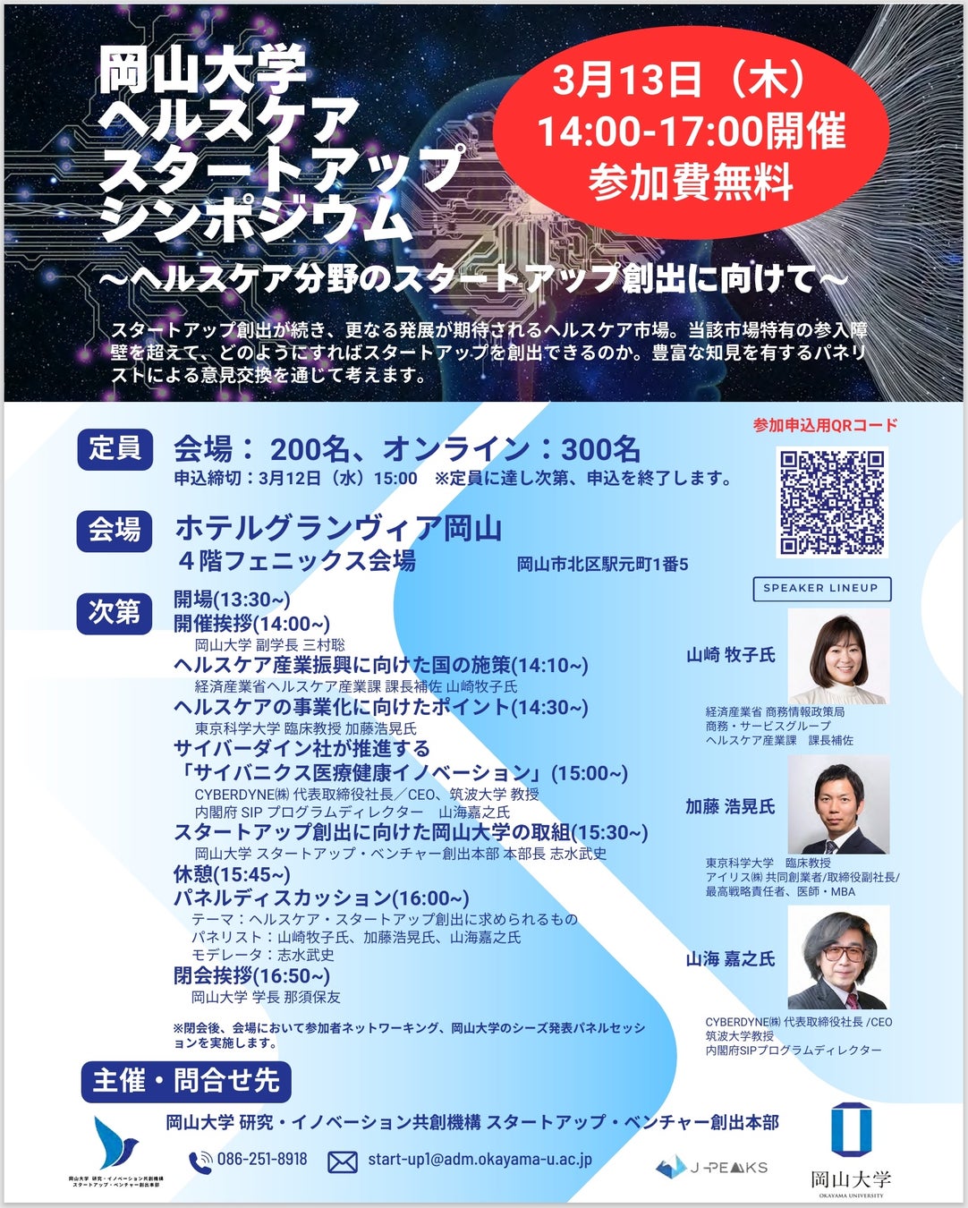 【岡山大学】岡山大学ヘルスケアスタートアップシンポジウム ~ヘルスケア分野のスタートアップ創出に向けて~〔3/13,木 ハイブリッド開催〕