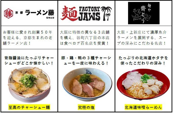 各地から選りすぐりの名店が集結!前半後半ともに各5店舗、全10店舗が絶品ラーメンを提供します!ラーメンはトッピング代を除き全て1,000円(税込)で販売!