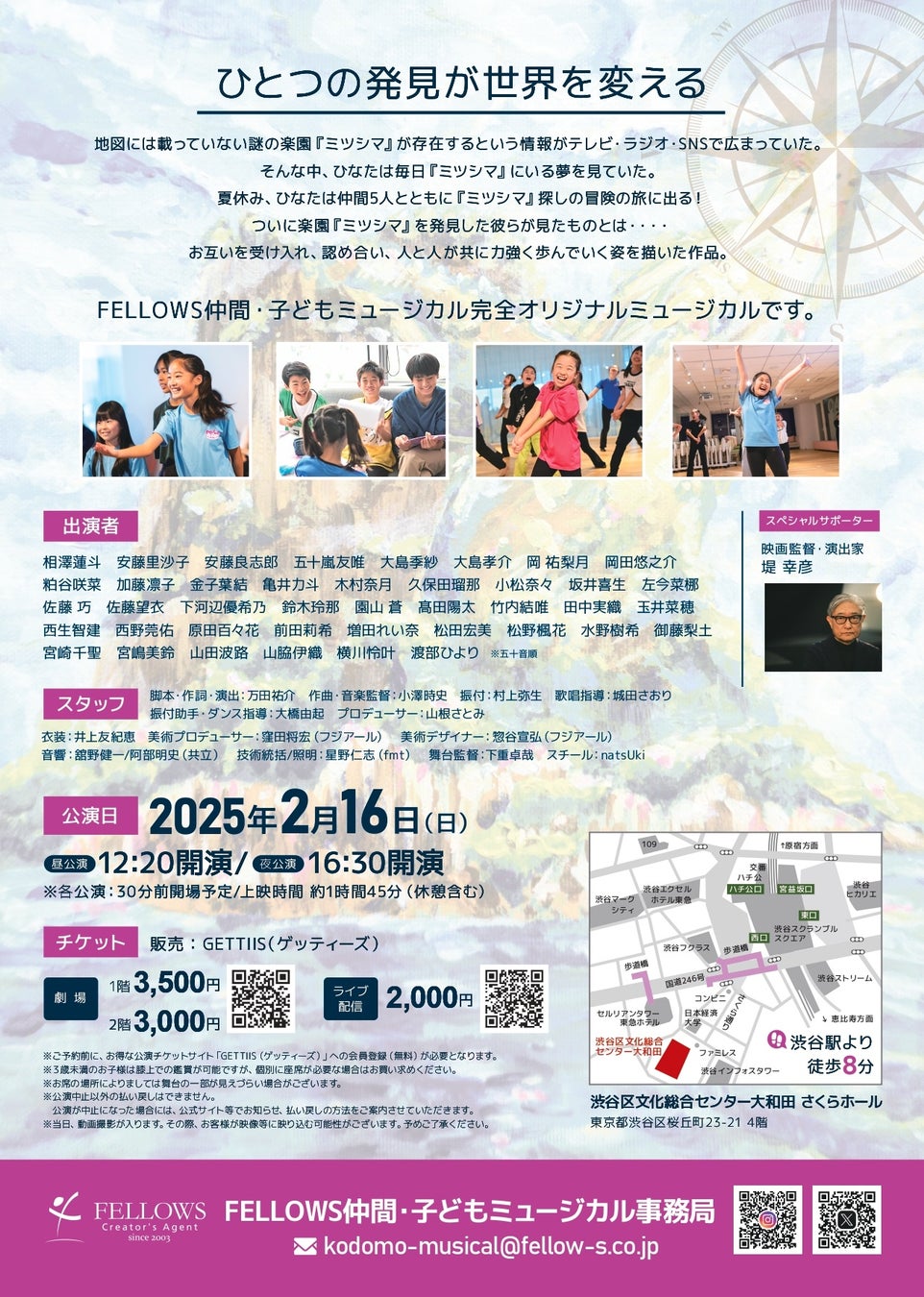 クリエイター専門の人材マネジメント(紹介・派遣)を行う株式会社フェローズが子どもの情操教育のため、そして次世代クリエイター誕生に貢献するため立ち上げた新たなプロジェクトFELLOWS仲間・子どもミュージカル。