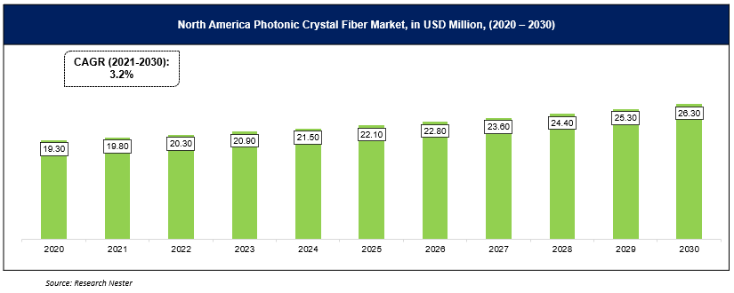 ヨーロッパ地域の市場は、2020年の2,600万米ドルの収益から、2030年末までに3,590万米ドルの最大の収益を獲得すると予想されています。この地域の市場は、予測期間中に3.4%のCAGRでさらに成長すると予想されます。この地域の市場の成長は、フォトニクスおよびフォトニック結晶ファイバの分野で進歩するために、民間または官民パートナーシップを通じて活動している多数の市場プレーヤーの利用可能性に起因すると予測されます。さらに、2020年末までにすべての加盟国で少なくとも1つの5Gネットワークを立ち上げるという欧州委員会(EC)の成長する支援イニシアチブも、今後数年間で市場の成長に貢献すると予想されます。また、北米は、予測期間中に3.2%のCAGRで拡大すると予測されます。