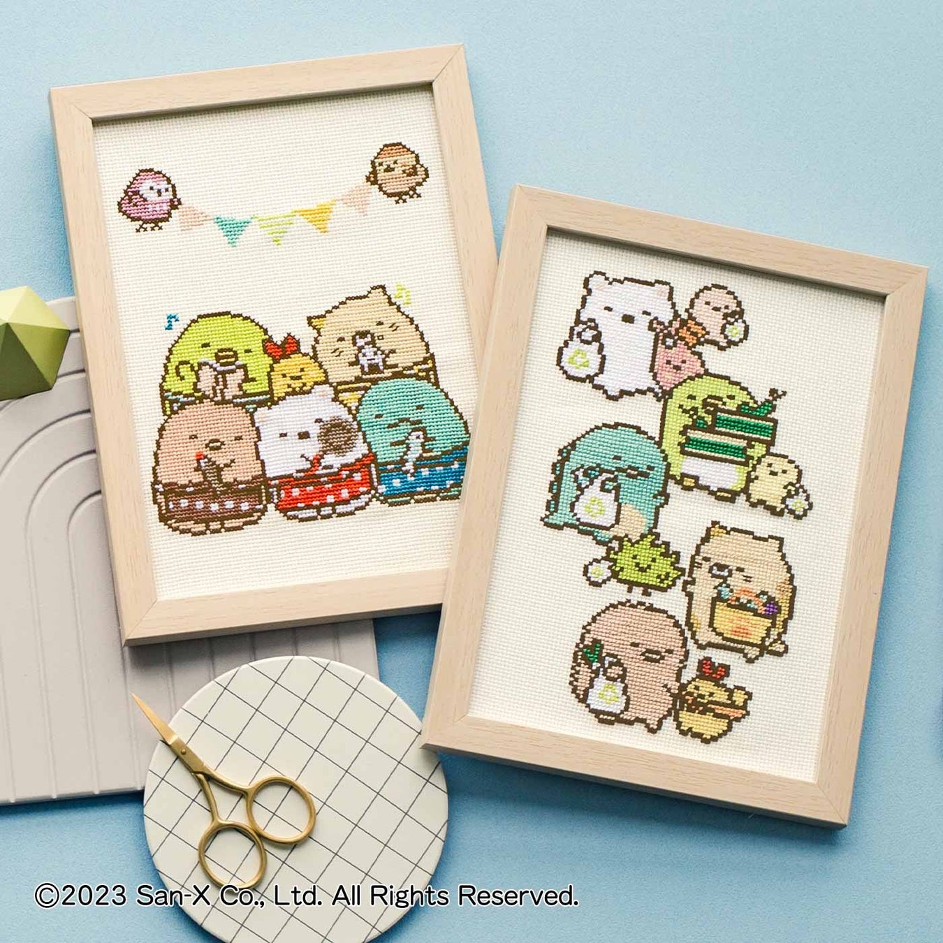 すみっコぐらし™のキャラクターたちが繰り広げる物語のテーマは50以上。テーマごとに描かれたたくさんのイラストの中から、キャラクターたちのさまざまな動きや表情を製作中も楽しめるような愛らしいデザインを図案化しています。すみっコぐらし™のゆるカワな世界観を、1キットにつき12~18色の刺しゅう糸を使って、クロスステッチで表現できるアイテムです。クロスステッチは、専用布を使ってマス目に沿って刺し埋めていくので、ビギナーでも図案通りに完成できます。