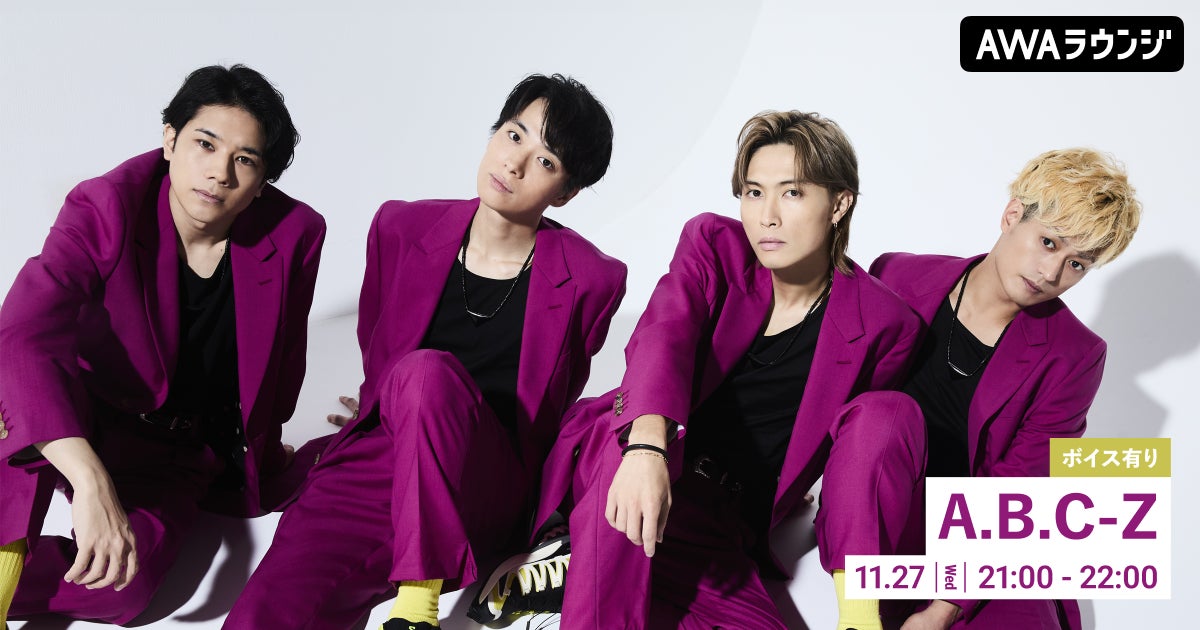 AWA株式会社(本社:東京都港区、代表取締役CEO:冨樫晃己)が運営する、サブスクリプション型(定額制)音楽ストリーミングサービス「AWA(アワ)」は、2024年11月27日(水) 21:00~22:00の1時間に渡り、無料で誰でも参加できるオンライン空間「ラウンジ」でA.B.C-Zを特集したイベントを開催いたします。