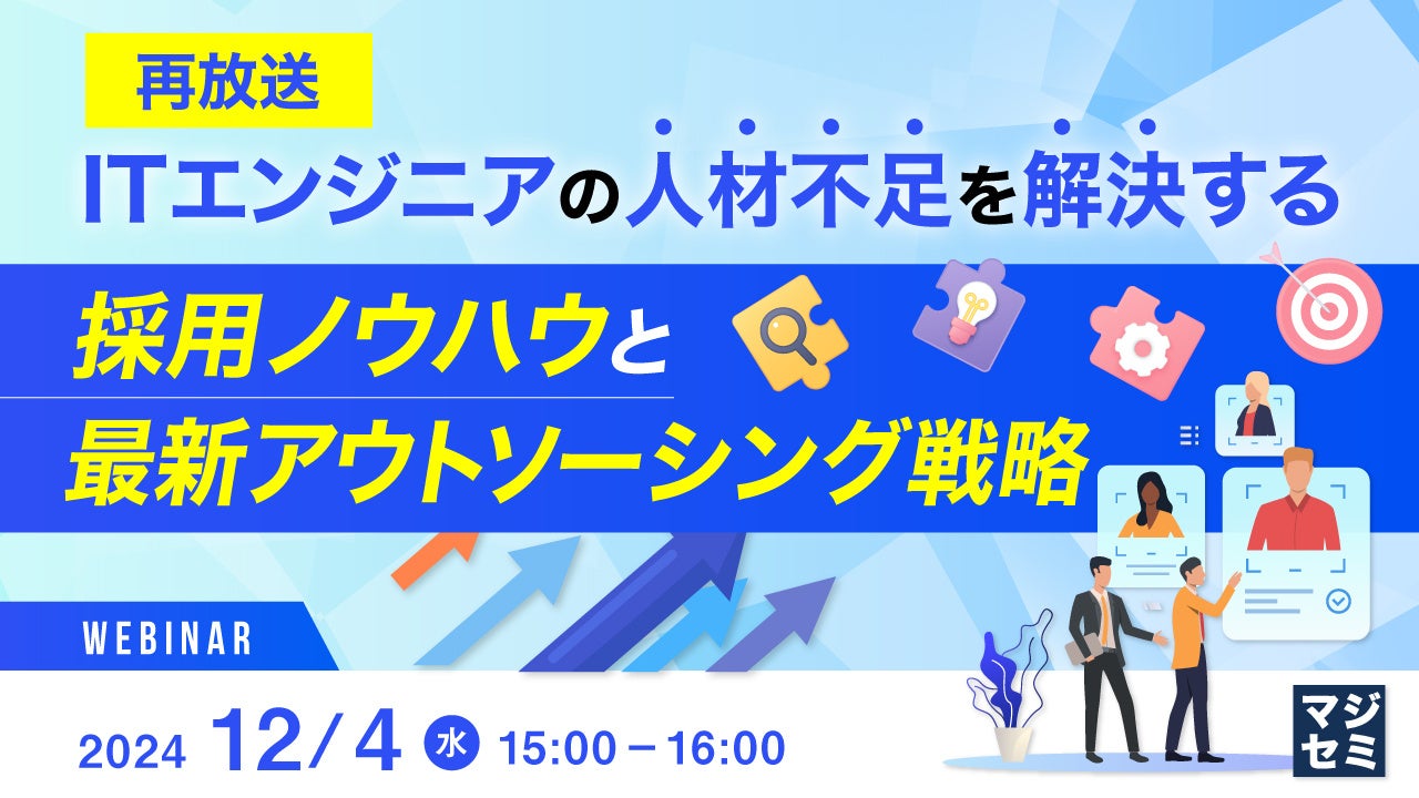 マジセミ株式会社は、大変好評をいただいた「【再放送】ITエンジニアの人材不足を解決する採用ノウハウと最新アウトソーシング戦略」というテーマのウェビナーを再放送します。