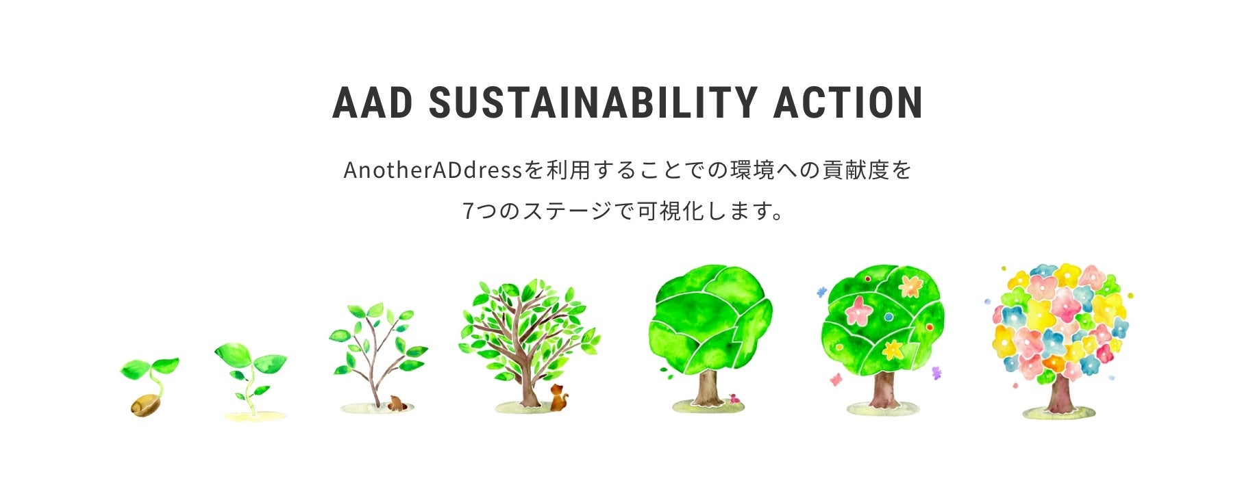 AnotherADdressは、今春サービス開始してから5年目を迎えます。ファッションを取り巻く環境課題に目を向け、ファッションを楽しむことを前提としながら、「(大量生産・大量廃棄を主因とする環境課題からの脱却による)持続可能なビジネスモデル」の実現に向けて様々な取り組みを行ってきました。節目を迎えるこのタイミングで、新たにサステナビリティページを公開すると共に、株式会社BiSUSと連携し「AnotherADdressの環境貢献度」を7つのステージで可視化します。ファッションサブスクで毎月自由にファッションを楽しむ中で自然とアクションポイントが貯まり、各ステージ毎でお客様の環境貢献度がリアルにわかる”AAD SUSTAINABILITY ACTION”を2025年3月12日(水)よりスタートします。