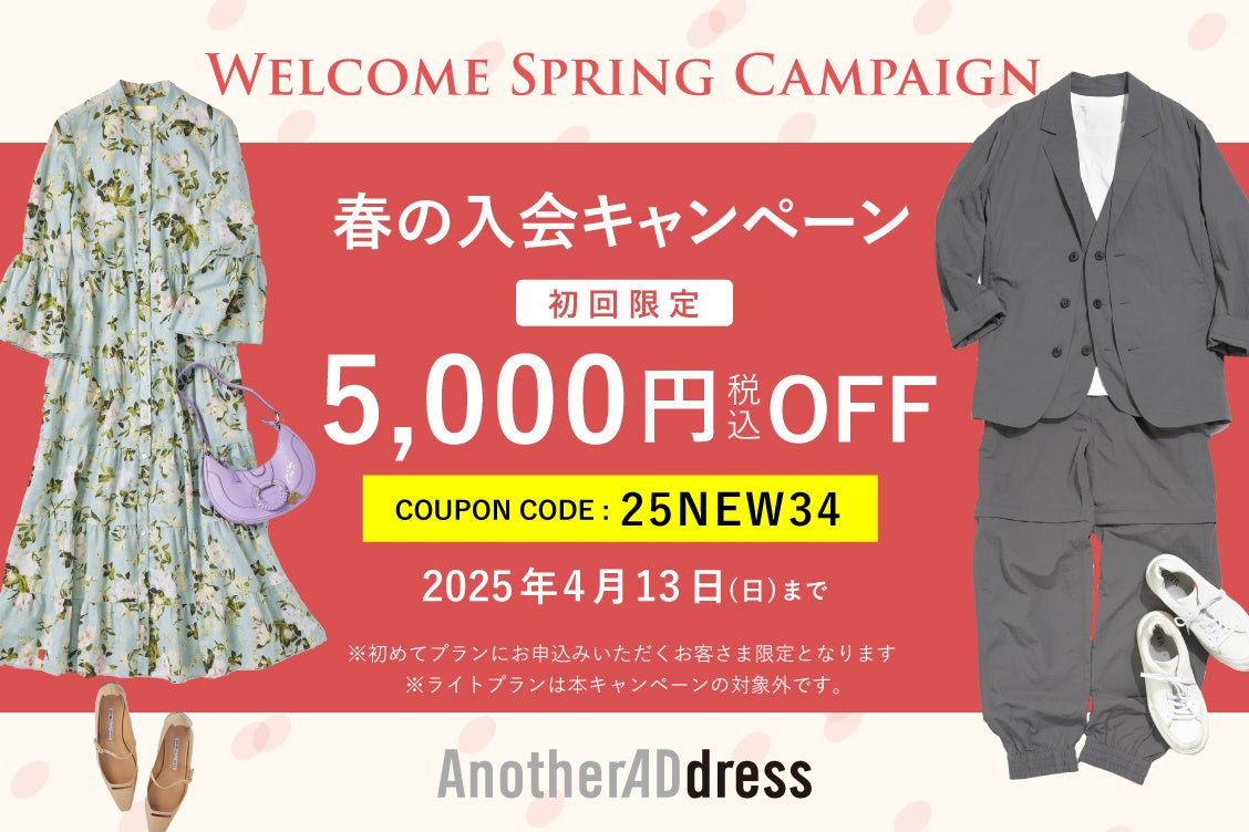 4月13日(日)までに入会したお客様限定、お得な特典をご用意いたしました。お出かけやご旅行、ビジネスなど、あらゆるシーンに合わせて、アナザーアドレスで新しいファッションライフを始めてみませんか?