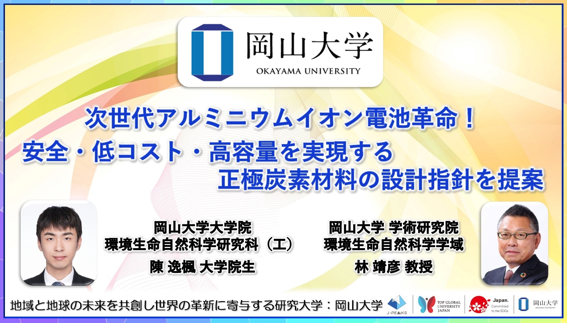 国立大学法人岡山大学(本部:岡山市北区、学長:那須保友)大学院環境生命自然科学研究科(工)に所属し、OU-SPRING生でもある陳逸楓大学院生、同大学学術研究院環境生命自然科学学域の鈴木弘朗研究准教授、西川亘助教、林靖彦教授等は、星和電機株式会社の梅澤成之博士(同大大学院自然科学研究科博士後期課程修了)と共同で、多孔質炭素の平均細孔径制御とアルミニウムイオンの吸脱着反応によって、安定に充放電できる高容量のアルミニウムイオン電池(AIB: Aluminum Ion Battery)に必要な正極PC材料の細孔物性の同定に成功しました。