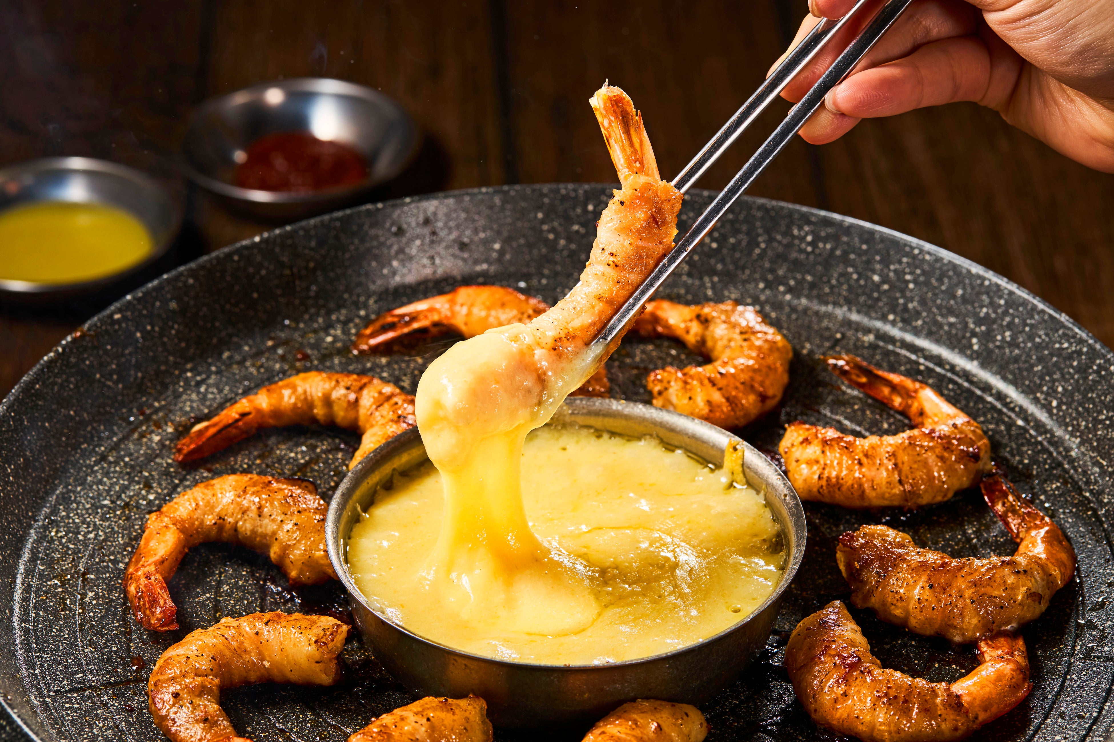 大ぶりの海老に、ジューシーな豚肉を贅沢に巻き付けた「海老ロールサムギョプサル」。中央で熱々に溶けたチーズにたっぷり絡めて食べる、フェアを象徴する一品です。海老のぷりぷり食感と、豚肉の旨み、そこに重なるチーズのコクが食欲をどこまでも刺激します。口いっぱいに広がる濃厚な味わいをご堪能ください。