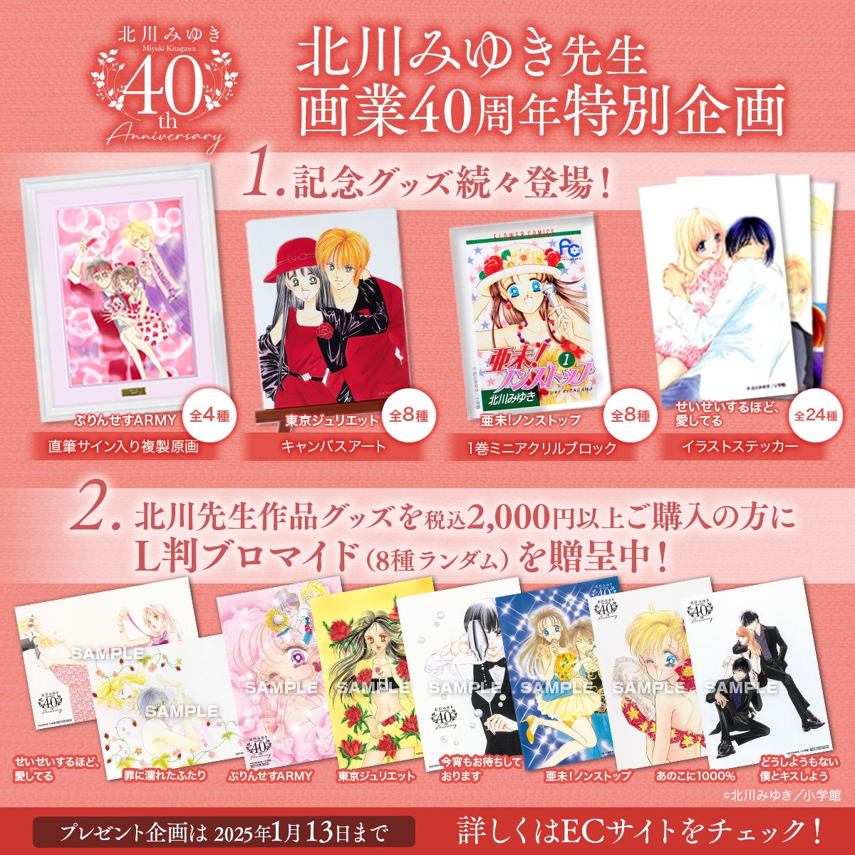 小学館の少女まんが作品公式通販サイト「ブルームアベニュー」にて、北川みゆき先生の画業40周年を記念した商品を2024年12月5日(木) より発売いたします。