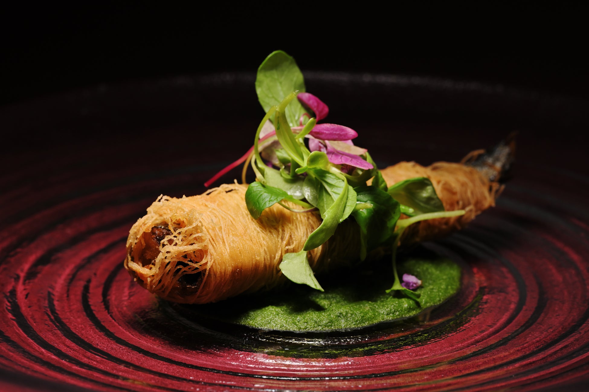 温物/あゆのコンフィ カダイフ巻き ズッキーニと蓼のピュレ