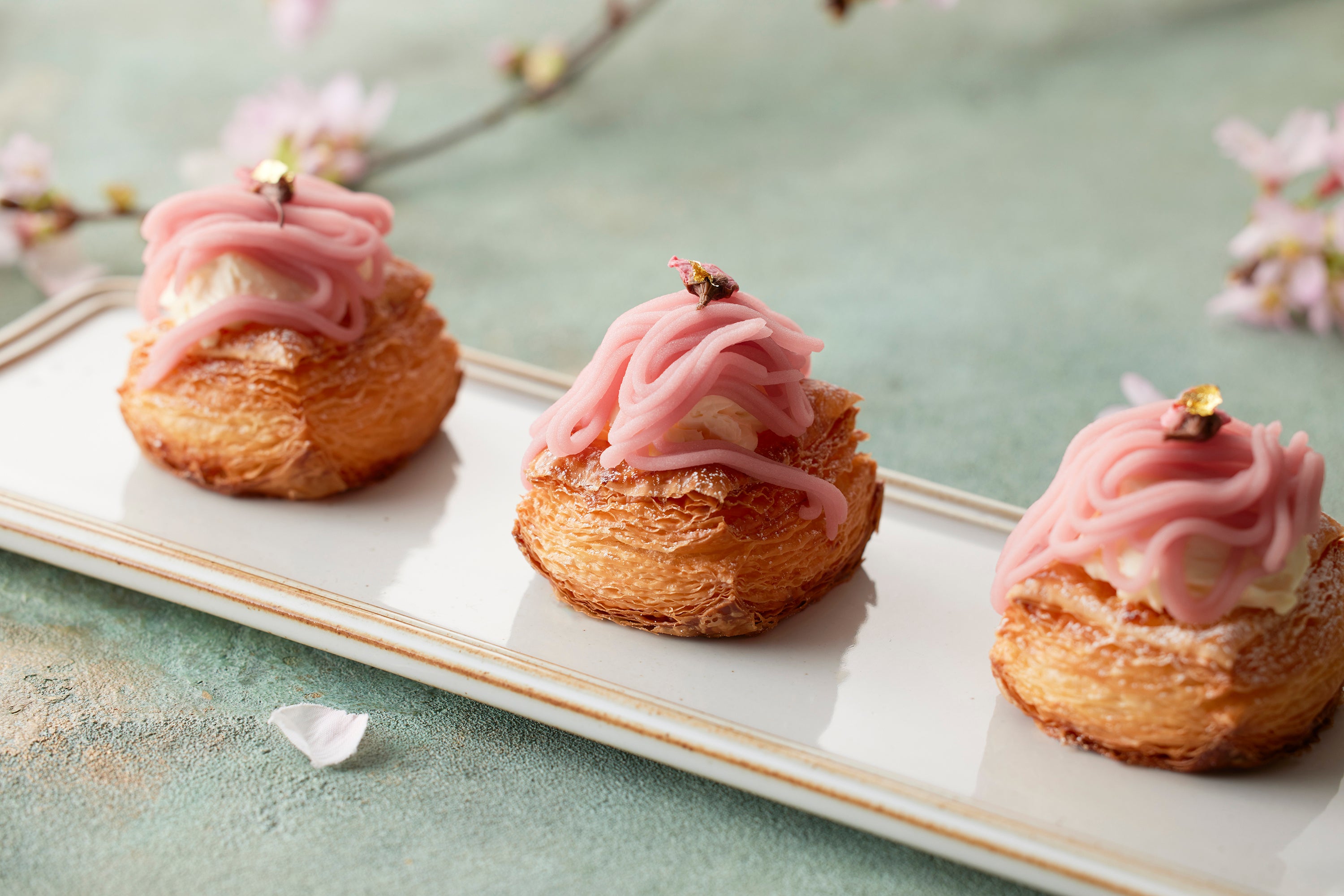 フランスで特別な場で提供されるお菓子として親しまれているサントノーレを、桜の季節にあわせて日本風にアレンジした一品。サクサクのタルト生地にフランボワーズのシュークリームを乗せ、桜の優しい風味とフランボワーズの酸味が相性抜群のクリームを絞った、春にぴったりの華やかなスイーツです。