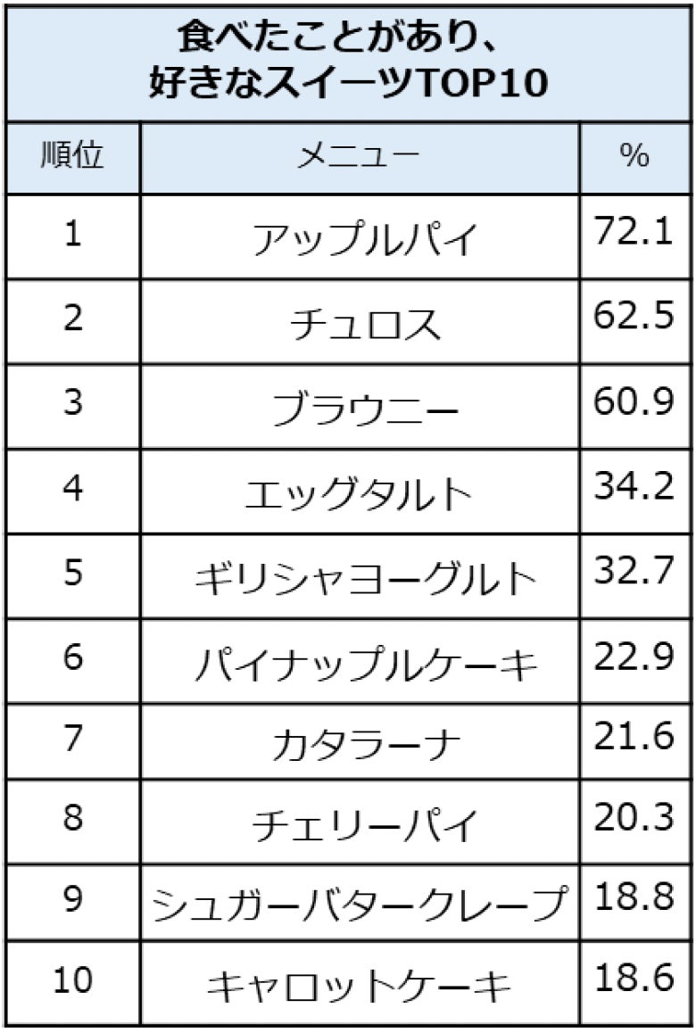 「食べたことがあり、好きなスイーツ」に関する調査では、「アップルパイ」(72.1%)が圧倒的な人気を誇り、「チュロス」(62.5%)、「ブラウニー」(60.9%)が続く結果となりました。「アップルパイ」「ブラウニー」に加え、「チェリーパイ」(20.3%)、「キャロットケーキ」(18.6%)などはアメリカ発祥のものやアメリカ家庭料理のイメージが強く、アメリカンなスイーツが定番のものとして愛されていることがわかります。また、「エッグタルト」(34.2%)や「ギリシャヨーグルト」(32.7%)といった、最近専門店を目にする機会が増えてきたスイーツも上位にランクインしました。