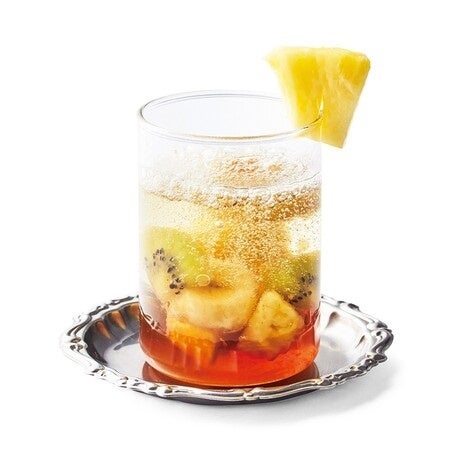 濃く入れたお茶に砂糖を加えて、甘いティーシロップに。冷やしたティーシロップにフルーツを入れ、 ゆっくり炭酸水を加えたらグラデーションが綺麗なティーパンチの完成です。