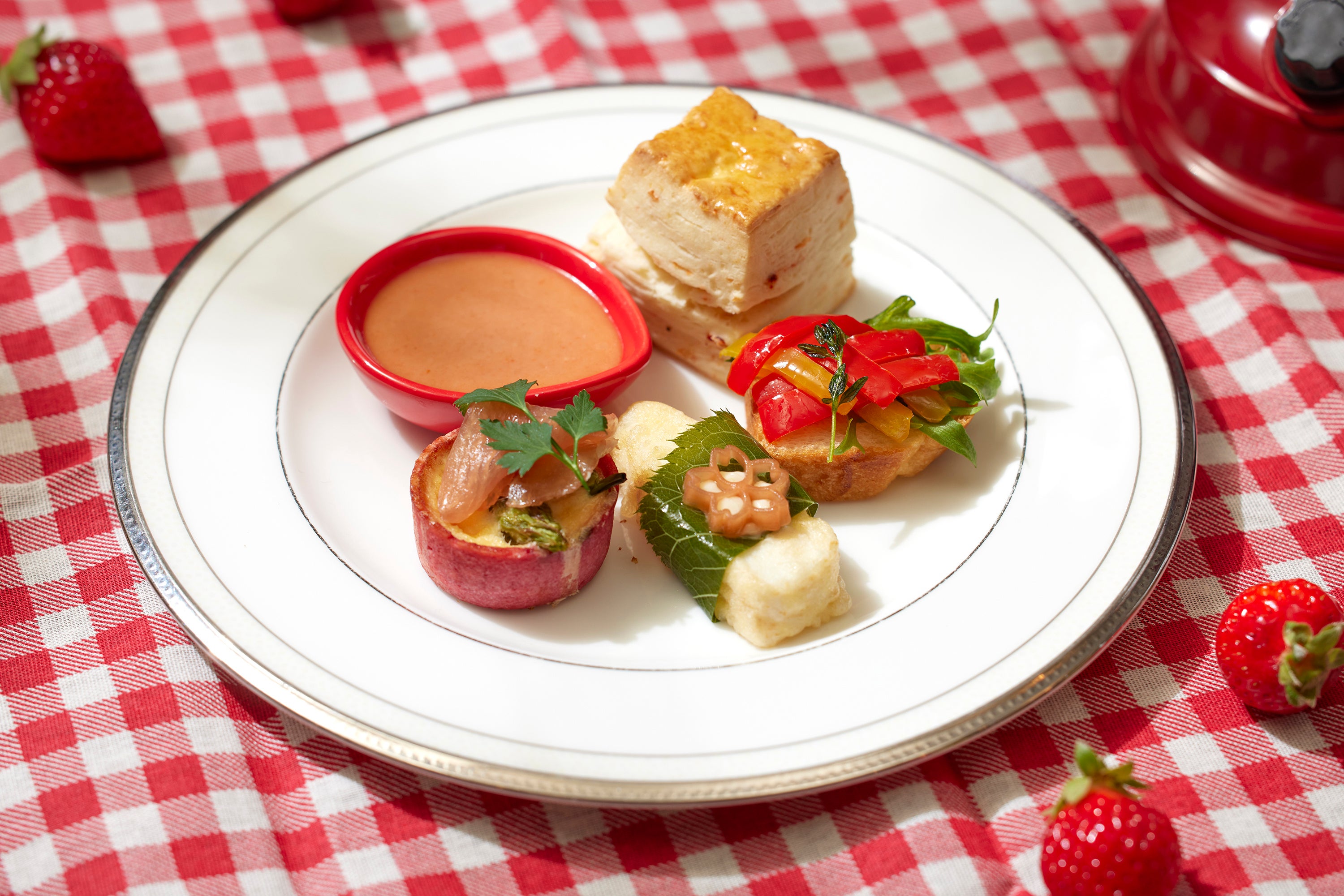 上段の「あまおういちごのティラミス」は、チョコレートのボックスの中に、糖度と酸味のバランスが抜群のあまおういちごを使用したティラミスを入れ、濃厚ながらも爽やかないちごの味わいがお楽しみいただける一品です。トップにも真っ赤で艷やかなあまおういちごを飾り、周りにはいちごのジュレをあしらい、華やかな見た目に仕上げました。中段は、フルーティーな味わいと可愛らしい色合いが魅力のルビーショコラのフォンデュをご用意。お好みで国産いちご、バームクーヘン、マシュマロをディップして召し上がりいただくスタイルで提供いたします。下段には、ビーツを使った赤いタルト生地に焼き上げた「春野菜のキッシュ 生ハム添え」や、「ブリオッシュと赤パプリカのピペラード」など、“レッド”を基調とした本格派のセイボリーを揃えました。