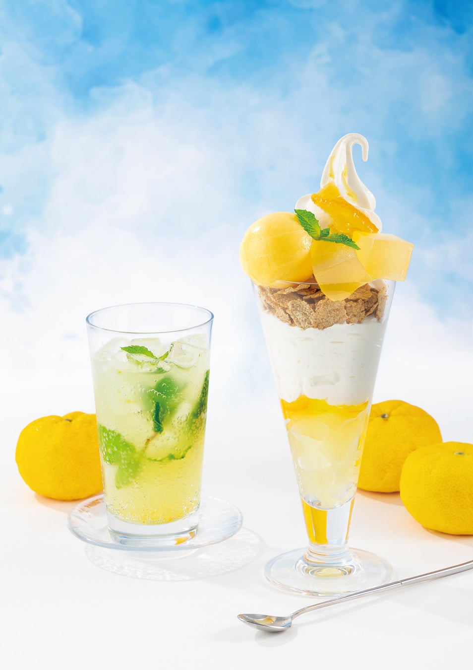 国産柚子の爽やかな酸味と、もちもちわらび餅の甘さで夏を楽しむ、きらめきゆらぐ夏パフェです。柚子ソースがかかったソフトクリームや柚子シャーベットで、暑さに熱った身体をクールダウン。柚子の香りで、夏のすっきりとしたカフェタイムをお楽しみください